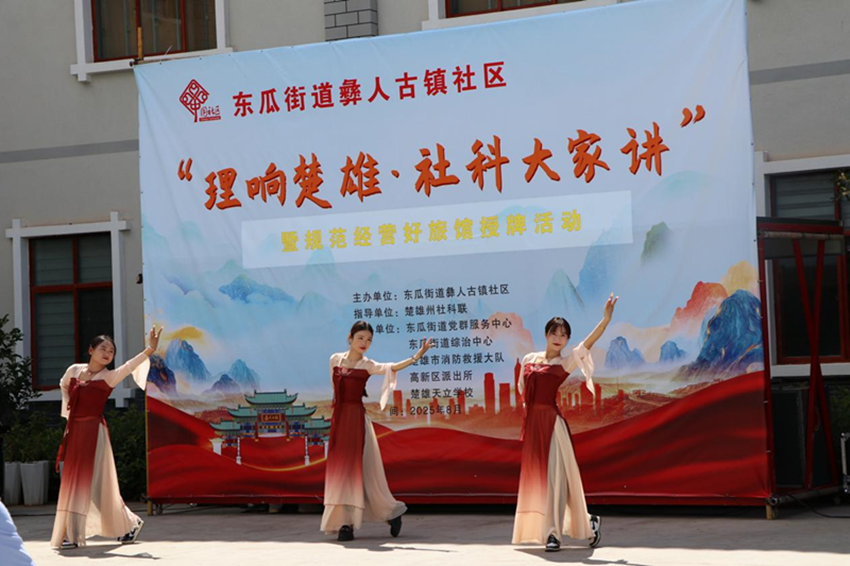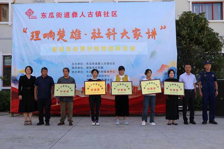 新时代民族网讯(云南日报云新闻记者 陈明海 通讯员 武爱群、余昌国)理论宣讲深入浅出,示范授牌树立标杆,文艺表演精彩纷呈……2025年9月2日下午,一场别开生面的“理响楚雄·社科大家讲”暨彝人古镇社区规范经营好旅馆授牌活动在楚雄(高新区)零工市场内举行。活动由彝人古镇社区主办,旨在将党的创新理论与社科知识送至基层,探索以行业规范促进社区治理的新路径,构建共建共治共享新格局。