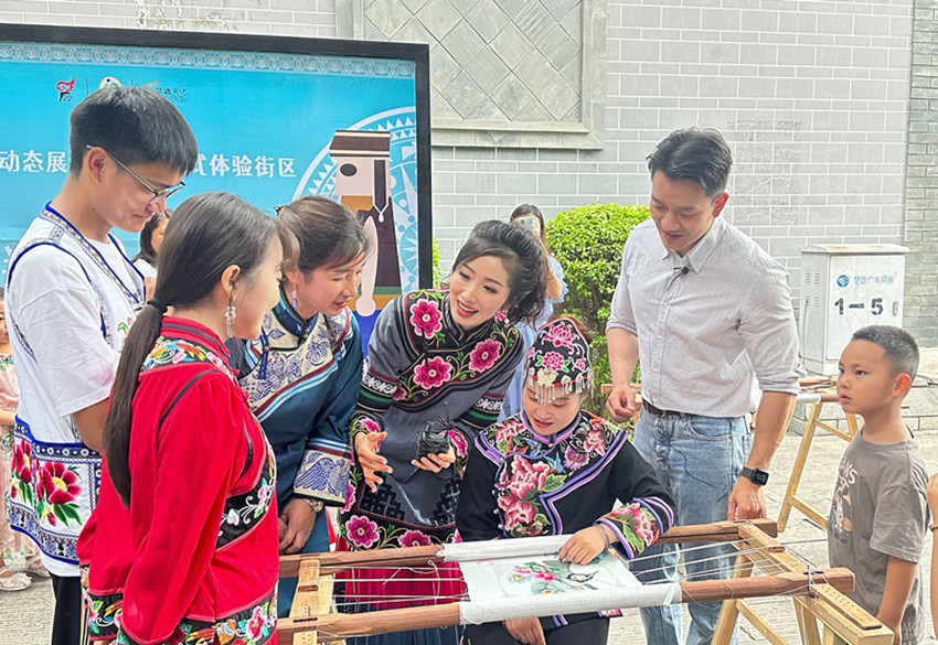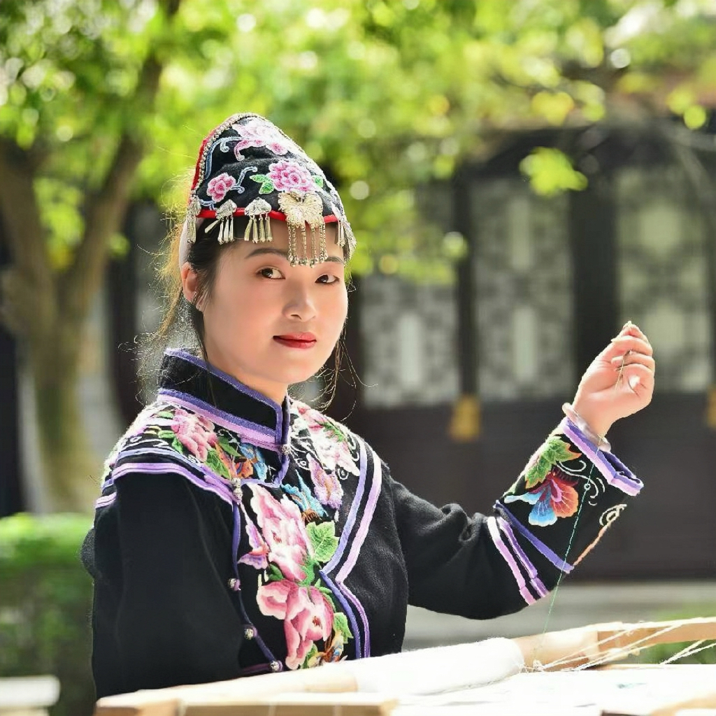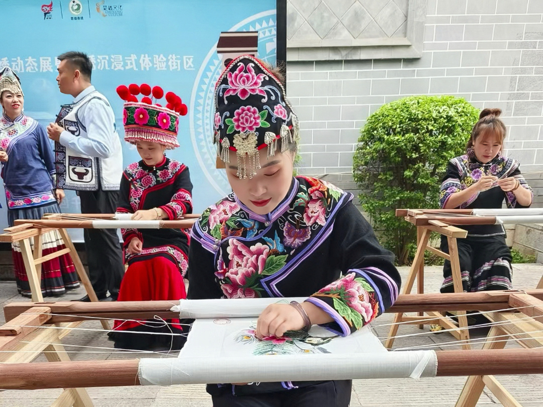 于是,工作之余,她背着绣花绷子,深入家乡的彝族村寨,接连走访了百余位老艺人。一街乡田房村藏着打籽绣的秘密,她便跑到村里的古树下,向80岁的阿婆讨教。阿婆颤抖着双手演示打籽绣——每绣一针就打一个小结,待小结铺满布面,一朵朵立体感十足的马缨花便悄然“盛开”。她一边用手机记录下珍贵的技法,一边将各种纹样细细记在笔记本上。经过她和团队的共同努力,打籽绣、螺旋绣等4种濒临失传的古老针法重见天日,马街桂花帽、五街火草麻布等珍贵传统服饰工艺也得以“复活”,为彝绣文化的存续筑牢了根基。