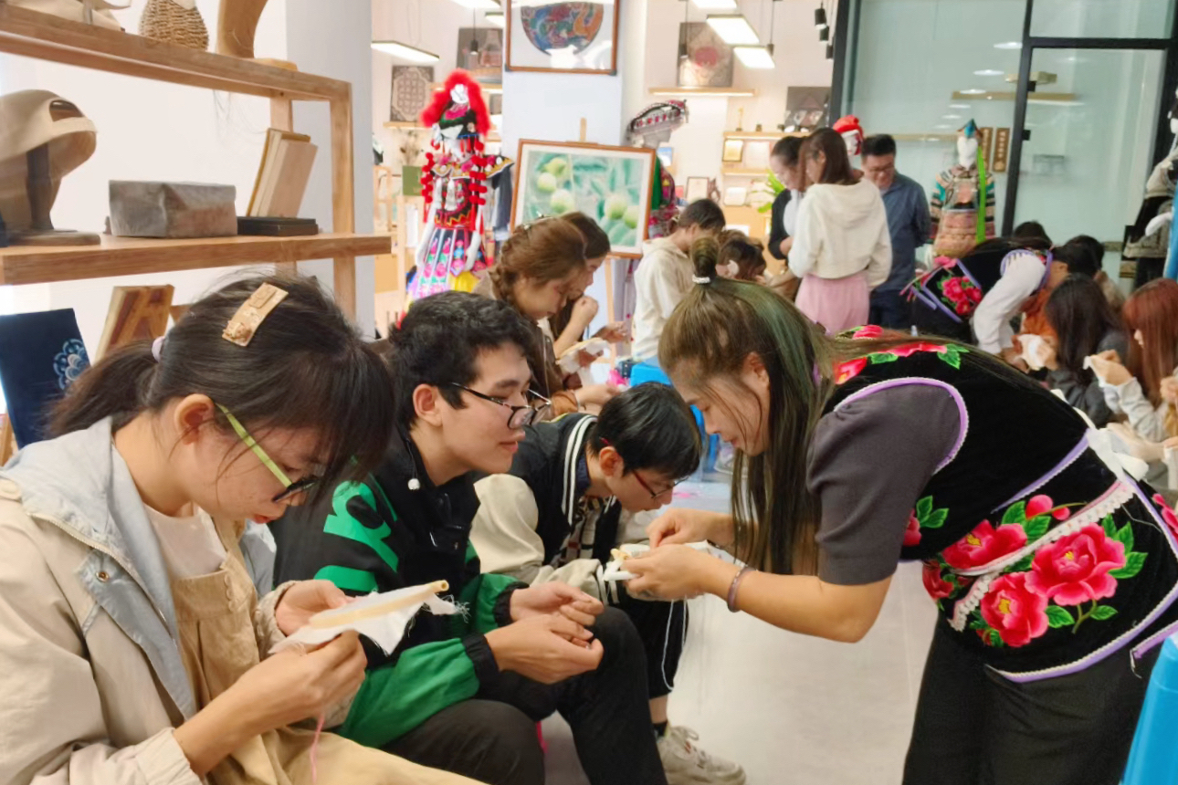 通过“招就培传帮带”模式,李国秀先后培养了段丽香、罗丽等5名亲传弟子,她们均成长为“彝族刺绣”技艺能手和企业技术骨干。在车间的绣架前,她把复杂的盘金绣拆解成简单步骤,手把手教段丽香练习基本功。这个曾经连针都拿不稳的山妹子,后来凭着作品《锦绣长城》拿下省级金奖。罗丽也不负所望,学成后就接下了马街扶贫车间的担子,带着当地姐妹绣出了她们的“致富路”。为了让更多人拿起绣花针,她联合团队深入山区,241期的刺绣培训班像种子般撒进大山,培养了16000多名学员——其中有背着娃娃听课的彝族阿妈,也有坐着轮椅前来的残疾绣娘。马街镇的谢琼芬因身体残疾难以找到稳定工作,学会刺绣后每月能挣3000多元,脸上的笑容比绣出来的马缨花还灿烂。这些年,培训班培养出省州县三级彝绣传承人23名,助力35名残疾绣娘获评“楚雄州百名残疾绣娘”,为彝绣产业注入强劲人才动能。同时,还将技艺推广至姚安、双柏、昭通等地,甚至走进了国外学生的针线筐,为国内外600余名青年学生授课,架起了文化互鉴之桥。