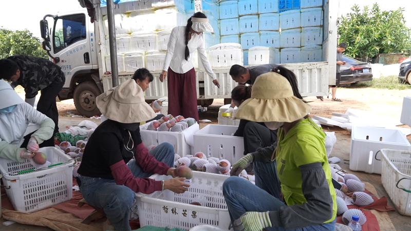 在海拔1700多米的永仁县永兴傣族乡小庄村3000多亩的芒果园里,沉甸甸的凯特芒缀满枝头。果农鲁大姐家种植凯特芒果26亩,目前,挂果的有12亩,只见她手捧一颗凯特芒果,脸上满是笑意,正组织工人们有条不紊地分拣、包装。今年她家凯特芒果产量预计达1万公斤,预计可实现收入4万多元。永仁县永兴傣族乡小庄村芒果种植户鲁晓芹说:“我家今年的芒果大丰收,产量高品质好价格也理想,这个芒果就是我们增收致富的摇钱果。”