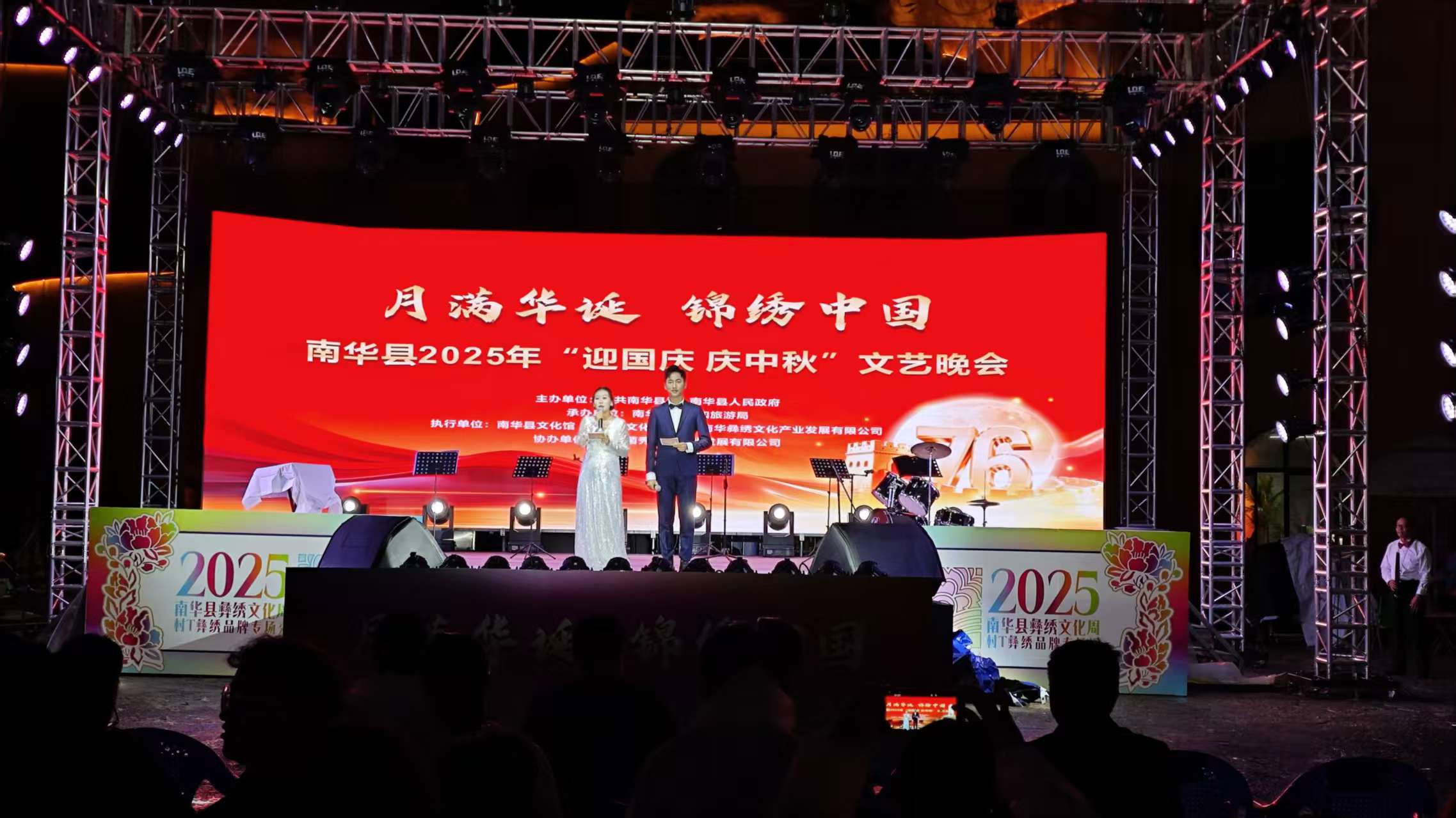 家国同庆, 彝绣是文化的鲜活注脚 开幕式晚会上,以彝绣为主题的《十指生花》《山野菌趣》《彩羽飞扬》《茶香遇》等特色节目轮番登场,精湛的彝绣技艺与野生菌文化、茶韵文化、飞羽文化的碰撞融合,让观众沉浸式感受南华非遗的独特魅力。从昆明赶来的游客李女士说:“这次近距离看到把彝绣元素融入舞蹈,既美又有文化味儿,一下子就被这种传统技艺的鲜活表达打动了。” 彝绣,不仅是楚雄彝族群众代代相传的指尖技艺,更是当地文脉绵延的生动注脚。截至目前,南华县已拥有各级非物质文化遗产项目57个,其中省级项目12个、州级项目15个、县级项目30个。在这片土地上,从镇南月琴的装饰纹样到火草麻布的刺绣点缀,从传统文化的民俗场景到现代休闲的各种形式,很多地方都能寻到彝绣的身影——即便是看似与刺绣无关的特色美食,也在千百年传承中融入了彝绣图样的美学设计,形成了独特的非遗文化景观。