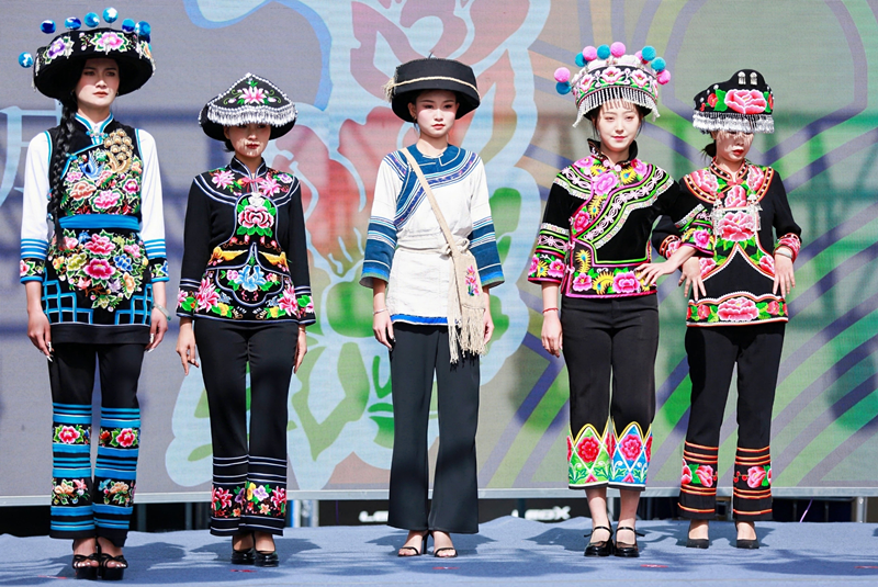 新品发布, 彝绣是传统和潮流的缝合线 活动现场,“村T”再次成了全场焦点——17套承载着彝族历史记忆的传统服饰依次亮相,细腻的针法、古朴的纹样尽显彝绣传承之美;随后发布的茶、菌、飞羽、YOUNG四大系列27个彝绣新品,更让传统技艺与现代生活实现了精彩碰撞。这些新品涵盖主题服饰、时尚饰品及文创周边,将彝绣元素与日常用品巧妙结合,展现出“年轻彝绣”的全新活力。 作为连接传统与潮流的“缝合线”,南华县近年来在彝绣产业发展中始终坚持守正创新。一方面,以传统技艺为根基,深入挖掘整理推出72种彝绣针法,通过开展火草麻布制作、传统刺绣等技能培训,让古老技艺在新一代传承人手中得以延续;另一方面,针对现代审美需求改良彝绣纹样与色彩,并拓展应用领域,开发出文具、家居装饰、服饰配件等系列文创产品,既保留了彝绣蕴含的民族文化内涵,又契合当下消费者的生活场景与审美偏好。 “家里长辈更偏爱传统样式的彝绣服饰,我们年轻人则喜欢这种带着民族温度的现代设计,现在这些新品让不同年龄段的人都能找到喜欢的彝绣产品。”参与菌主题服饰展示的模特李娜分享道。