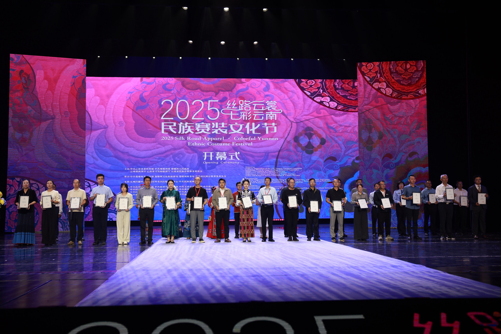 开幕式现场议程紧凑、意义深远。活动对为“丝路云裳·南博时装周”“第三届楚雄时装周·中国国际时装周”作出突出贡献的单位予以表彰,为“楚雄彝绣杯”非遗服装服饰创意设计大赛获奖作者颁发荣誉,充分激发各界参与非遗保护、民族文化传承的积极性。同时,南亚东南亚非遗指数(楚雄)发布中心项目合作协议正式签订,彝绣非遗出海全球计划同步启动。系列举措不仅标志着拥有1800年历史的楚雄彝绣加速迈向国际舞台,更凸显出这门千年非遗在推动民族文化交融、促进中外文明互鉴中的重要价值,现场各民族代表、各界人士齐聚一堂,共同凝聚起“民族共绣、共享发展”的强大共识。