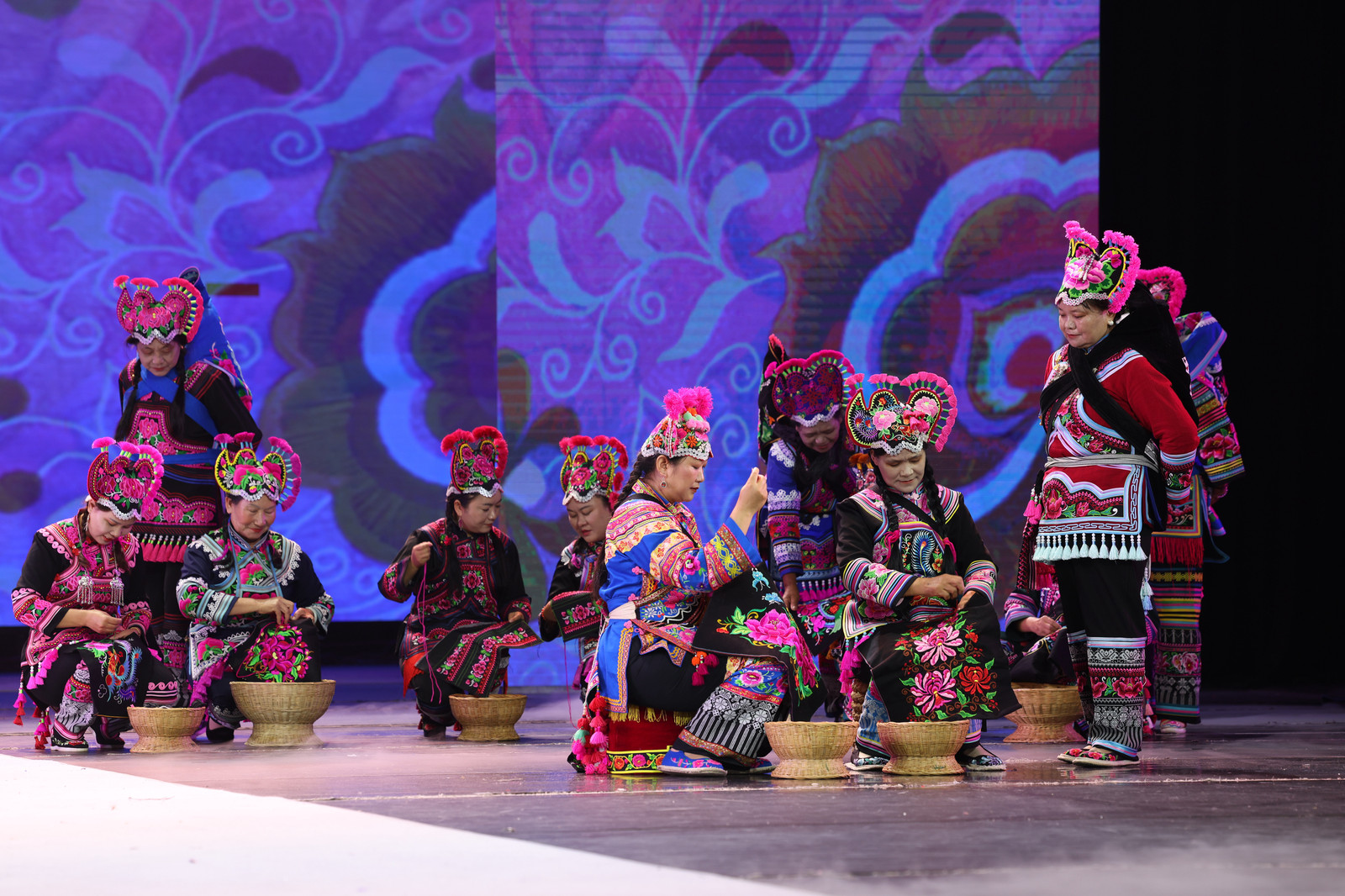 启幕演出以“千年赛装”“丝路云裳”“美美与共”“世界共享”四大篇章为脉络,铺展一幅恢弘的民族文化长卷。展演服饰中,彝族马樱花图腾融入现代服装剪裁,传统云纹与白、傣、哈尼等10余个民族的刺绣技法交织融合,每一件作品都是民族文化交融的鲜活载体,将楚雄彝绣“穿在身上的史诗”转化为可感知、可认同的文化符号。正如当地七彩彝绣公司践行的“民族彝绣、民族共绣、民族共享”理念,各族匠人以针线为媒,在技艺切磋中增进民族情谊,让彝绣从单一民族文化标识,升华为各族群众共同珍视的中华民族共有文化财富。