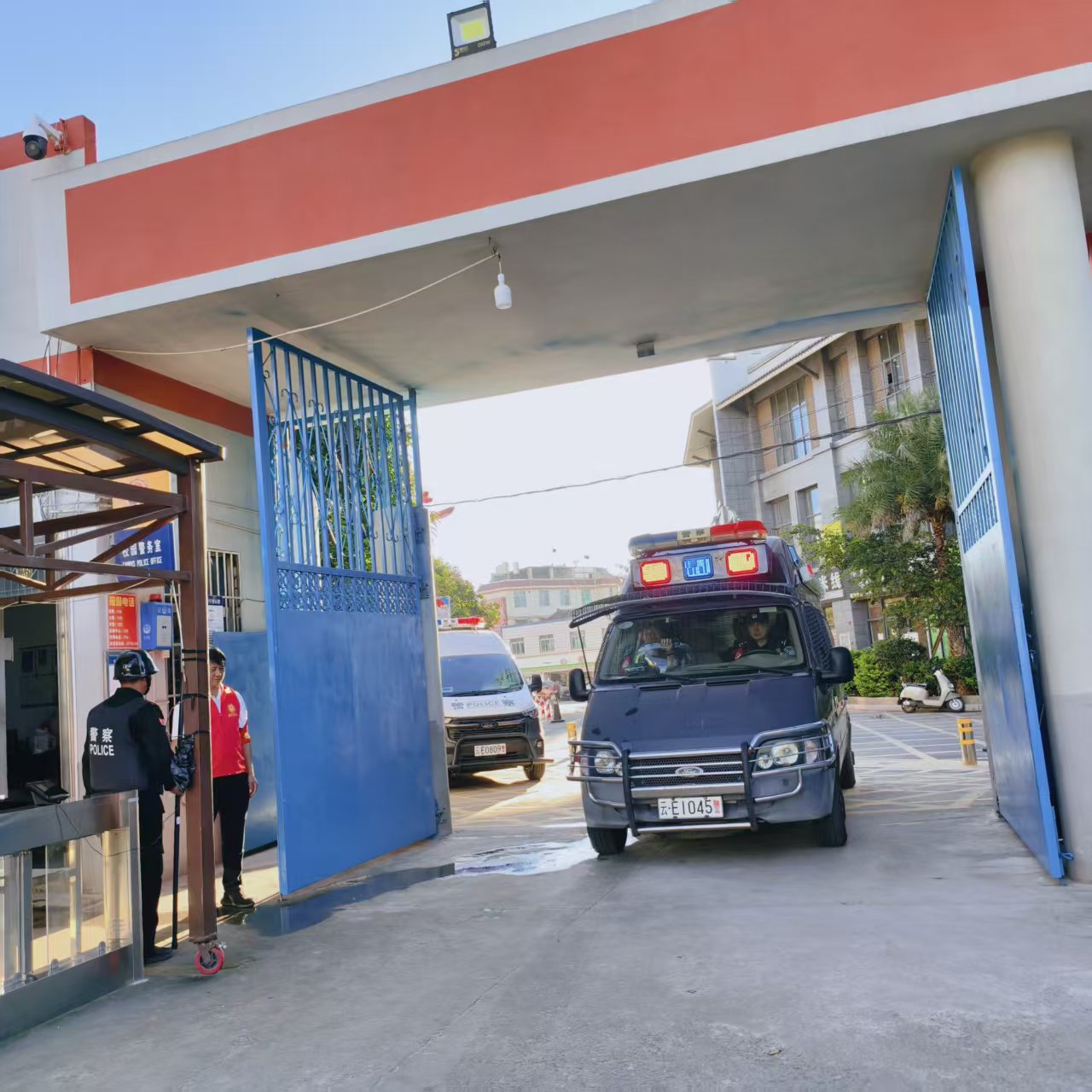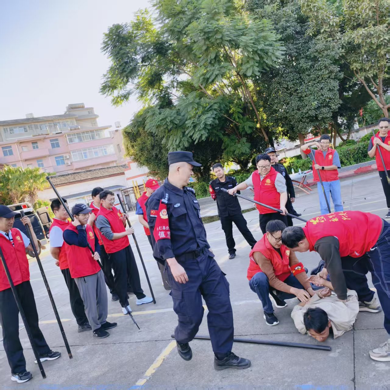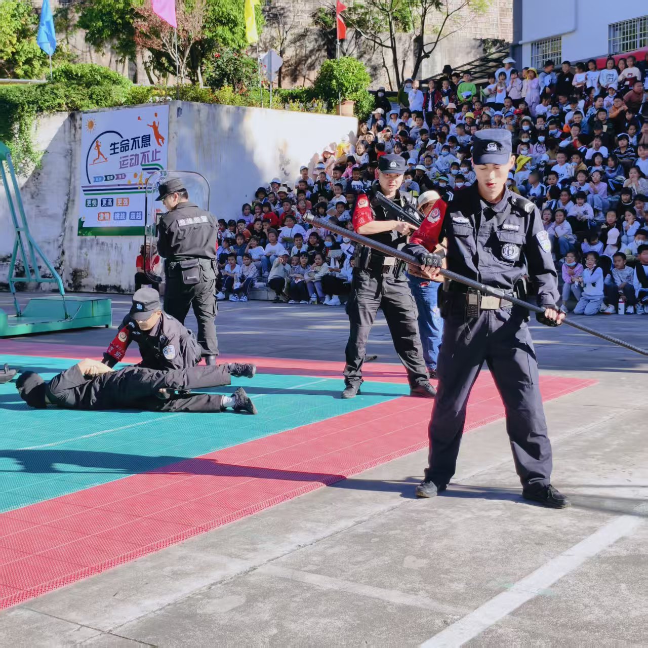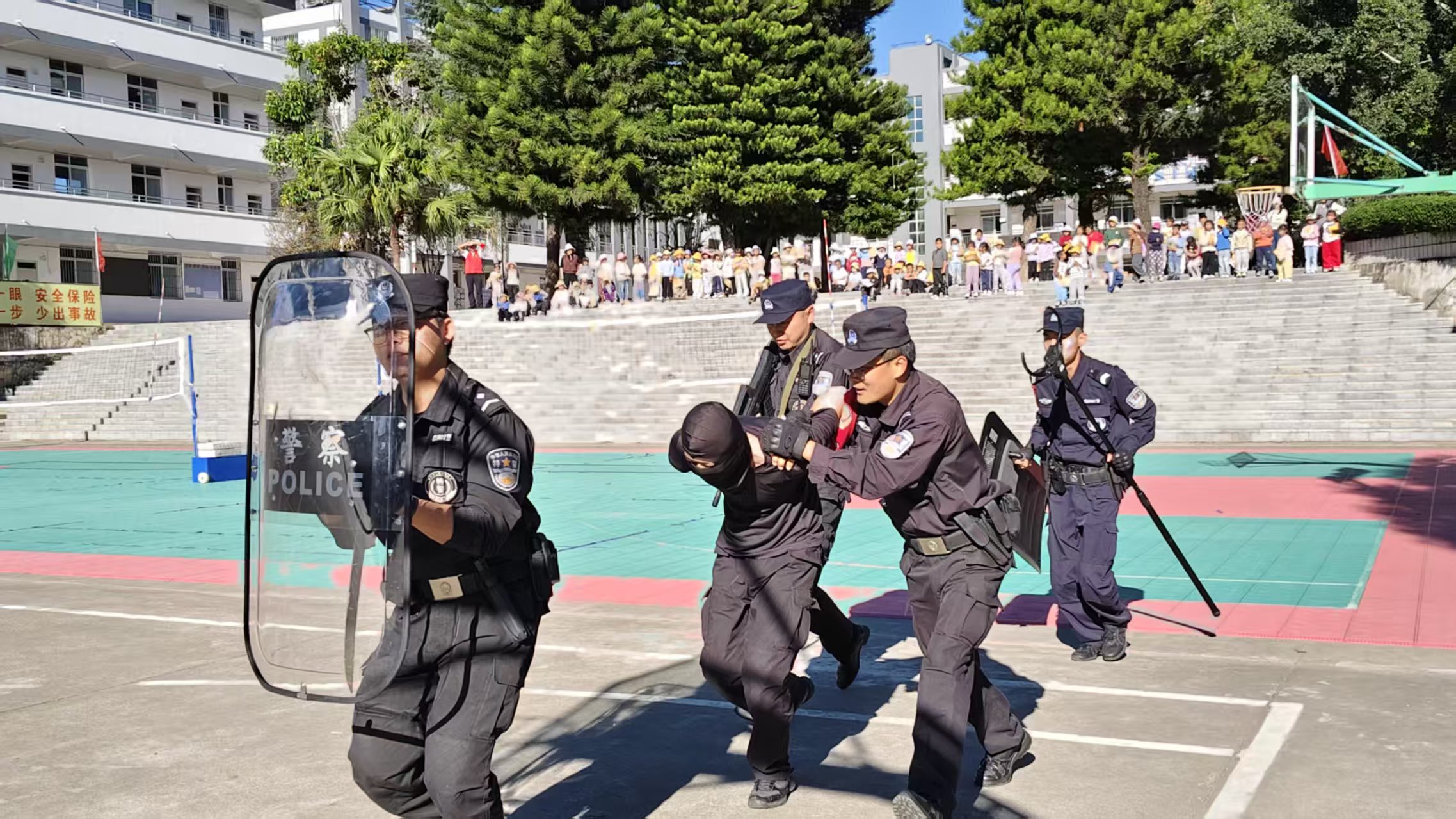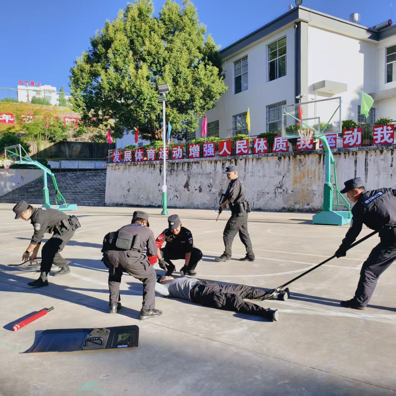 演练伊始,主管安全的副校长作动员讲话,强调演练意义,要求师生学用结合,强化安全意识。随后,特巡警结合典型案例,用通俗语言宣讲防暴知识,解读“逃、躲、斗”核心技能,明确报警关键要素,筑牢思想安全屏障。 器械教学环节,特巡警与学校应急保卫组联合实操教学,展示防暴盾、钢叉等器械,示范握持、攻防及协同战术,组织安保人员和应急小组成员分组实战体验,手把手指导掌握格挡、牵制等技能,提升应急实操能力。