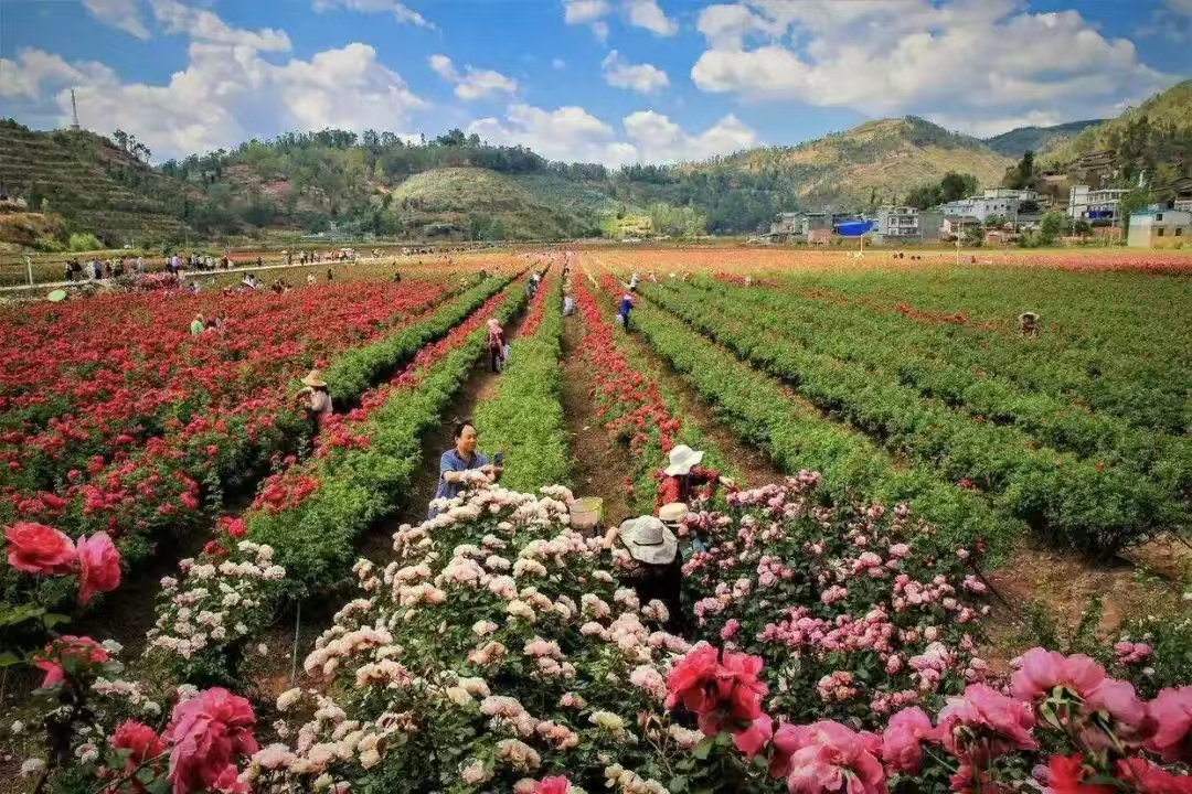 新时代民族网讯(作者系姚安县人民政府办公室 陈嬿如)在壮美的滇中高原深处,有一片神奇而美丽的土地,一座因花而兴的小城正在上演着乡村振兴的动人故事,那就是我的家乡云南省楚雄彝族自治州姚安县。这里既有悠悠白云、蓝天碧水、有浓郁的民族风情、有花香四溢,四处弥漫着吃花、赏花、玩花的浪漫。 清晨,当太阳公公早早爬过山顶,远道而来的朋友来到了我的家乡做客,我带着昔日的小伙伴从县城驾车行驶10余公里到云秀花卉基地。车窗外满满的绿扑面而来,一片盎然生机的景象,放眼望去,连片的玫瑰花一团紧挨着一团,一朵朵含苞欲放的玫瑰花如同娇羞的少女一般,十分惹人喜爱。不一会,我们便乘车来到了花卉基地,我们一路观赏着,我们悠然自得的享受着沉浸在花丛中的小惬意与小美好,远处的蝴蝶也闻着阵阵花香迎着花丛的方向向我们飞来,时不时的还有一群蜜蜂小憩在花瓣上采蜜,空气中弥漫着醉人的芬芳。小伙伴在一旁兴奋的欢呼雀跃,“嘴里不停的说道:哇,你们快来看,这朵红玫瑰开得可娇艳了”。这时把正在拍照的游客也吸引过来围观。是啊,有谁又能拒绝这花香四溢的浪漫呢?哪怕是第一次来到这的人,都愿意在这里做一个浪漫又美丽的梦。