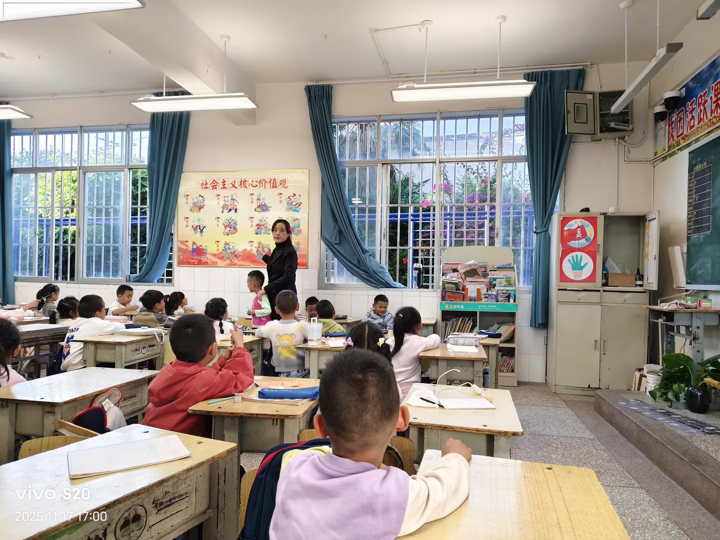 班会思辨,碰撞升华。各年级主题班会摒弃单向灌输,亮点纷呈。教师巧设议题,引导学生围绕“民主的真谛”“平等的践行”等话题深度思辨。童言稚语间,藏着对公平正义的向往,对诚信友善的坚守。思想的火花在交流中碰撞,24字箴言不再是高悬的文本,而是融入日常的行为标尺与价值灯塔。 诵读强基,内化于心。熟诵非终点,理解是初心。学校以适度背诵检查为抓手,助学生牢记核心要义,为价值观内化筑牢根基。我们深知,唯有记于心,方能践于行。这一过程,既是知识的巩固,更是价值观认同的关键一跃。