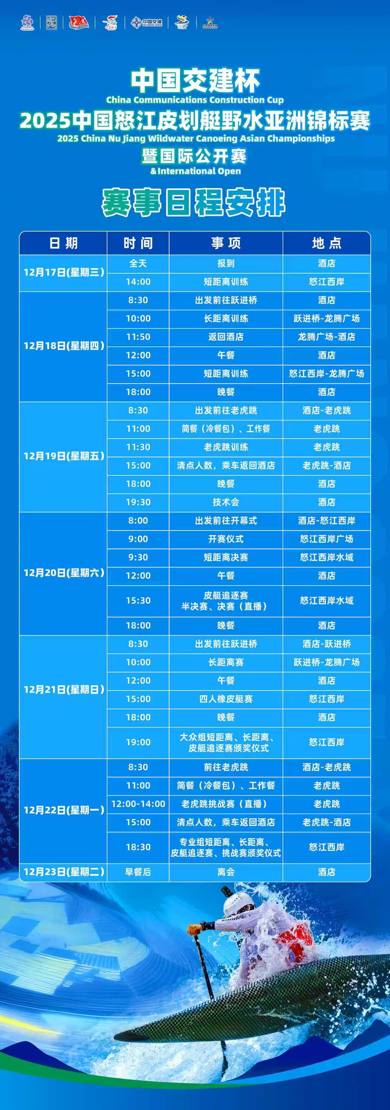 新时代民族网讯(云南日报云新闻记者 陈明海 文/图)峡谷怒江,激流蓄势。随着“中国交建杯”2025中国怒江皮划艇野水亚洲锦标赛暨国际公开赛进入最后筹备阶段,赛事完整日程于近日正式公布,这场备受瞩目的国际顶级野水赛事于12月17日启动报到,12月20日在云南省怒江州泸水市正式开赛,12月23日落幕,为期七天的赛程将全方位展现“白水天堂”的竞技魅力与跨文化交融活力。