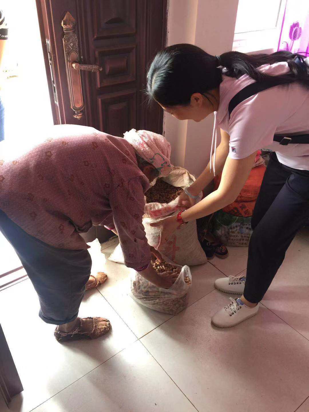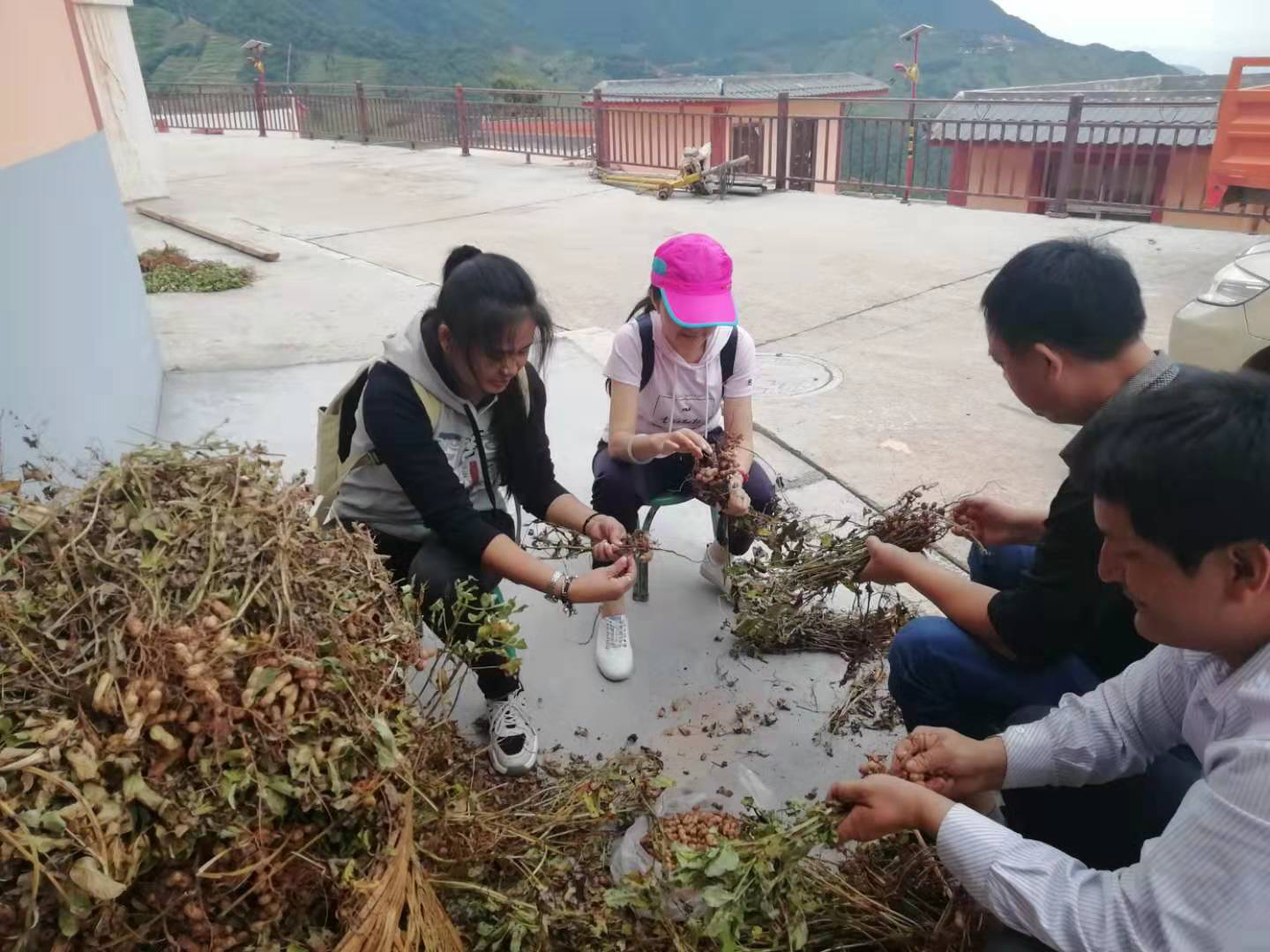 不止村委会,农户家的院子里同样很热闹。有的农户岁数大,腿脚不方便,州民宗委一部分干部直接去到了农户家,帮助他们把刚从地里挖出来的花生全部摘下来,分装好,再送到村委会供大家购买。