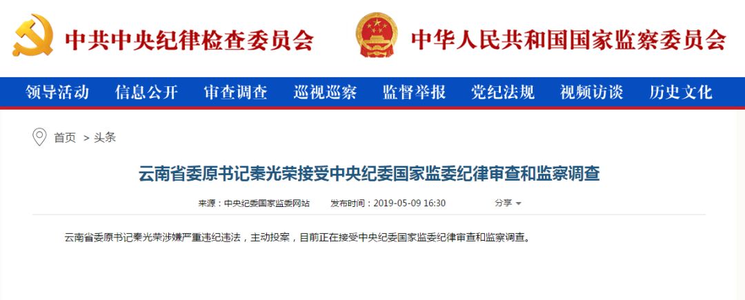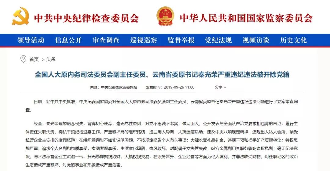● 9月26日,中央纪委国家监委网站发布消息,日前,经中共中央批准,中央纪委国家监委对全国人大原内务司法委员会副主任委员、云南省委原书记秦光荣严重违纪违法问题进行了立案审查调查。