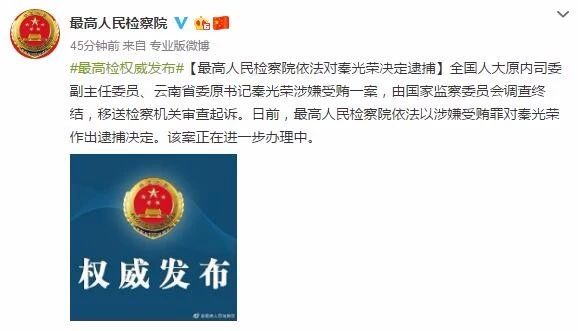 10月25日上午,@最高人员检察院 发布消息,全国人大原内司委副主任委员、云南省委原书记秦光荣涉嫌受贿一案,由国家监察委员会调查终结,移送检察机关审查起诉。日前,最高人民检察院依法以涉嫌受贿罪对秦光荣作出逮捕决定。该案正在进一步办理中。