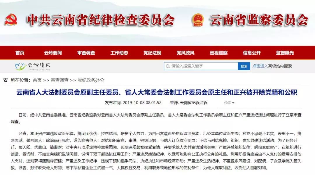 ● 2019年10月8日,据云南省纪委监委网站消息,日前,经中共云南省委批准,云南省纪委监委对云南省人大法制委员会原副主任委员、省人大常委会法制工作委员会原主任和正兴严重违纪违法问题进行了立案审查调查。