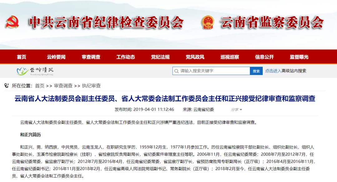 此外,云南省人大法制委员会原副主任委员、省人大常委会法制工作委员会原主任和正兴(正厅级)涉嫌受贿一案,由云南省监察委员会调查终结,移送检察机关审查起诉。日前,云南省人民检察院依法以涉嫌受贿罪对和正兴作出逮捕决定。案件正在进一步办理中。 和正兴简历 和正兴,男,纳西族,中共党员,云南玉龙人,在职研究生学历,1959年12月生,1977年1月参加工作。历任云南省检察院干部处副处长、组织处副处长、组织人事处副处长,玉溪市检察院副检察长(挂职),省检察院反贪局副局长,省纪委案件审理室主任等职。 2006年11月,任云南省纪委常委; 2008年7月至2012年7月,任云南省纪委常委,省监察厅副厅长; 2012年7月至2016年4月,任云南省纪委常委,省监察厅副厅长,省预防腐败局专职副局长(正厅级); 2016年4月至2016年11月,任云南省纪委副书记; 2016年11月至2018年2月,任云南省高级人民法院党组副书记、常务副院长(正厅级); 2018年2月至今,任云南省人大法制委员会副主任委员、省人大常委会法制工作委员会主任。 ● 2019年4月1日,据云南省纪委监委消息:云南省人大法制委员会副主任委员、省人大常委会法制工作委员会主任和正兴涉嫌严重违纪违法,目前正接受纪律审查和监察调查。
