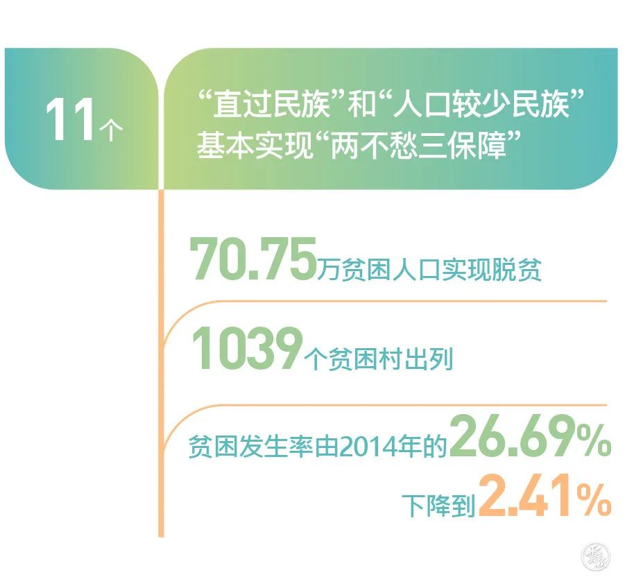 全面落实迪庆怒江“三区三州”脱贫攻坚实施方案,制定“直过民族”和人口较少民族帮扶行动计划,投入344亿元实施能力素质、劳务输出、安居工程、特色产业、改善基础设施、生态环境保护6大工程,极大地改变了边疆少数民族地区群众的生产生活条件,提升了干部群众的精神面貌。2015年至2019年,全省深度贫困地区贫困人口由250.3万人下降到36.5万人,贫困发生率从24.13%下降到3.52%。
