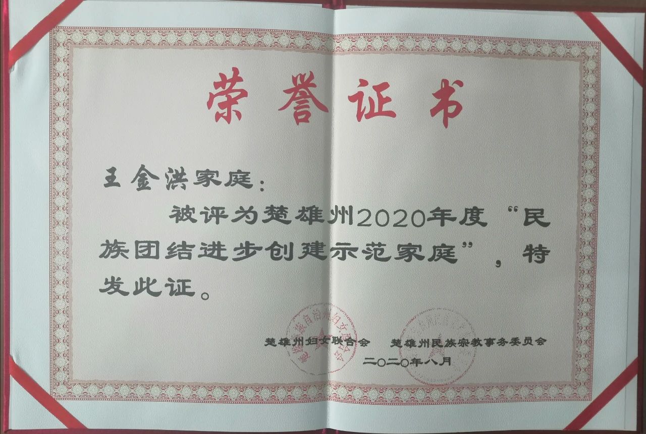 | 楚雄州丨王金洪家庭被评为楚雄州2020年度“民族团结进步创建示范家庭” | |