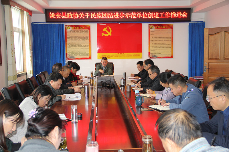 (梁荣 民族时报全媒体记者 陈明海)民族团结是各族人民的生命线,“民族问题无小事”,为认真贯彻落实习近平总书记关于民族工作的重要论述和考察云南重要讲话精神,紧紧围绕“中华民族一家亲、同心共筑中国梦”总体目标,结合省州县民族团结进步示范创建工作推进会议精神,10月20日,姚安县政协机关召开民族团结进步创建工作推进会,会上通报了《楚雄州全国民族团结进步示范区建设领导小组关于命名楚雄州第三批民族团结进步创建示范单位的决定》,经过择优推荐、严格审核、社会公示,姚安县政协办公室成功创建为姚安县5个楚雄州第三批民族团结进步创建示范单位之一。县政协相关职能部门表示:县政协的民族团结进步示范创建工作将再接再厉,切实按照省州县关于民族团结进步示范创建工作的要求和《姚安县民族团结进步示范单位创建标准》,在县政协党组的领导下,以政协各委室为平台,政协各委员活动组为纽带,政协委员为基础,围绕“大团结、大联合”这一主线抓好做实民族团结进步示范创建工作,争取早日获得省级民族团结进步示范单位的命名。