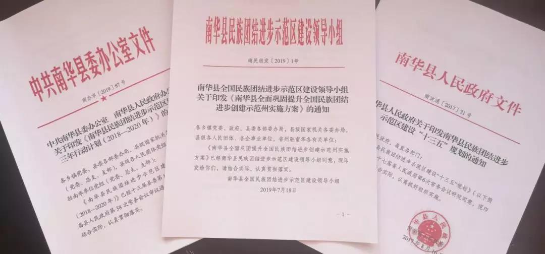抓组织领导,形成强推手。 成立了由县委书记、县长任组长、县委副书记任常务副组长的南华县全国民族团结进步示范区建设领导小组,出台了《南华县民族团结进步示范区建设“十三五”规划》《南华县民族团结进步示范区建设三年行动计划(2018—2020年)》《南华县全面巩固提升全国民族团结进步创建示范州实施方案》明确责任、细化措施,切实加强组织领导,全面巩固提升民族团结进步示范创建成果,全力推进全县民族团结进步事业向纵深发展。