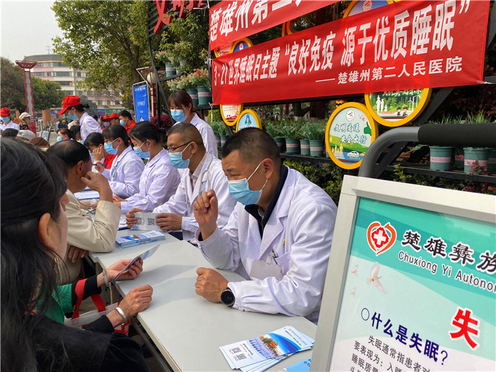 3月21日是第21个世界睡眠日,楚雄州第二人民医院睡眠医学中心在桃园湖广场开展以“良好免疫,源于优质睡眠”为主题的义诊宣传活动。