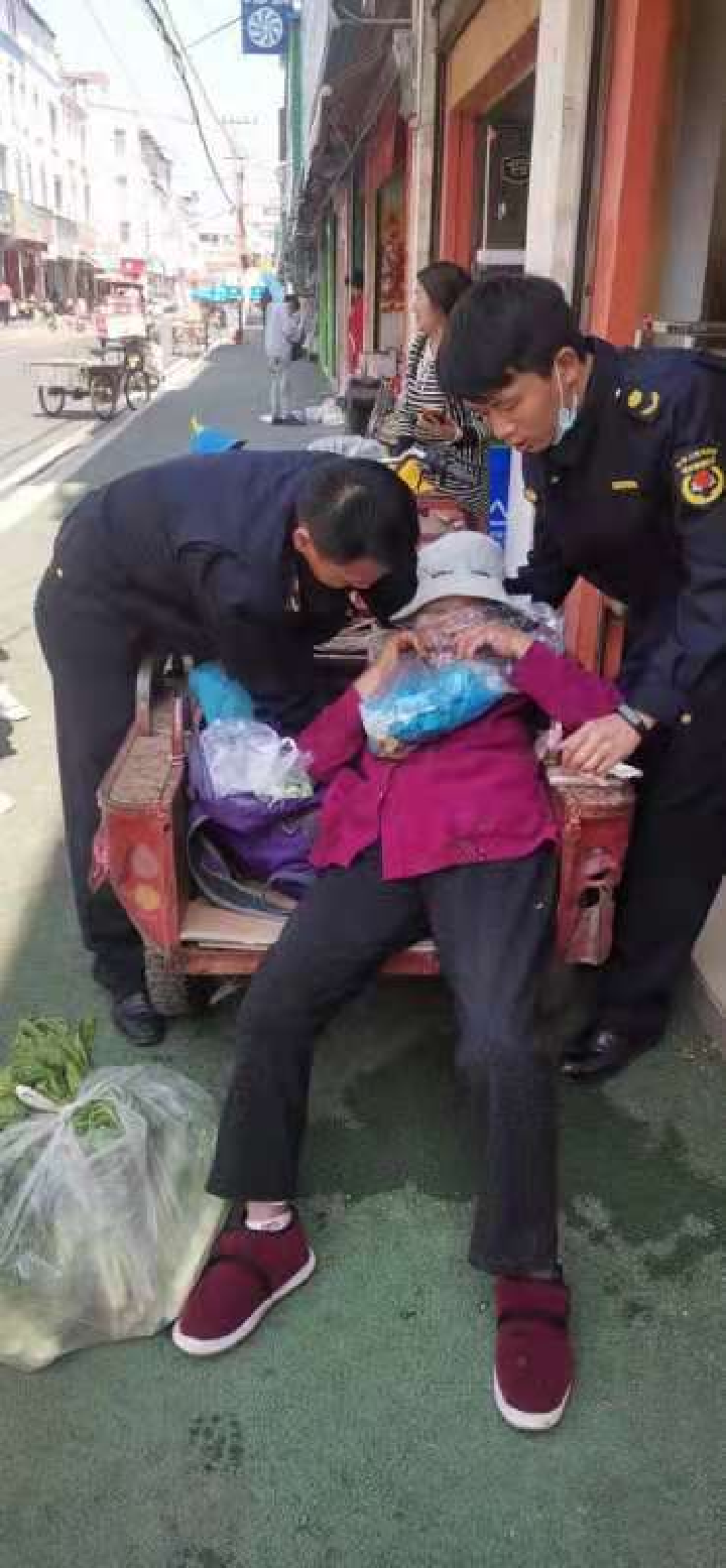 新时代民族网讯(钟劲松、袁晓梅)3月27日上午,在南华县龙泉市场后门附近,一名八旬老人在买菜的途中、因身体不适晕倒在地。正当路人不知所措之时,南华县住建局城管执法大队队员刘环鹏、鲁国飞、夏雪梅三人巡查经过,他们立即上前查看老人的情况,并立即疏散围观人群,防止行人对老人造成二次伤害,同时拨打110报警电话、联系老人家属,陪护在老人身边等待救援。几分钟后,老人的儿子及派出所民警先后赶到,城管队员刘环鹏在众人帮助下,将老人背至其儿子车上,送往医院救治。安顿好老人后,他们才安心离开,继续一天的巡查工作。据了解,目前老人病情已经稳定。