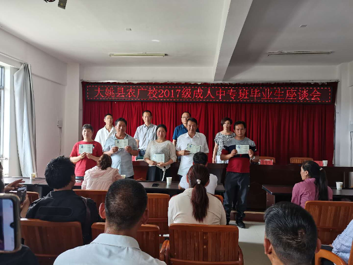 2020年7月6日,楚雄州农广校校长苏艳萍(右一)、大姚县农业农村局副局长缪成亮给学员颁发毕业证 大姚县农广校于1982年成立,是一所成人中等专业学校,现隶属于大姚县农业农村局,1991年7月通过省教委、省农牧渔业厅评估验收为“合格分校”。多年来,农广校坚持面向农业、农村、农民,面向农业现代化,面向市场,为农业生产服务、为农民脱贫致富服务、为乡村振兴服务的办学宗旨,通过广播、电视、多媒体、面授等现代化教学方式进行广泛的宣传培训。自招生办学以来,开设有种植、养殖、计生、畜牧兽医、现代乡村综合管理等专业,累计招生655人,其中389人获得了中专毕业证书,266人获得结业证书,学员学成后大多数都成为农村种、养殖能手。