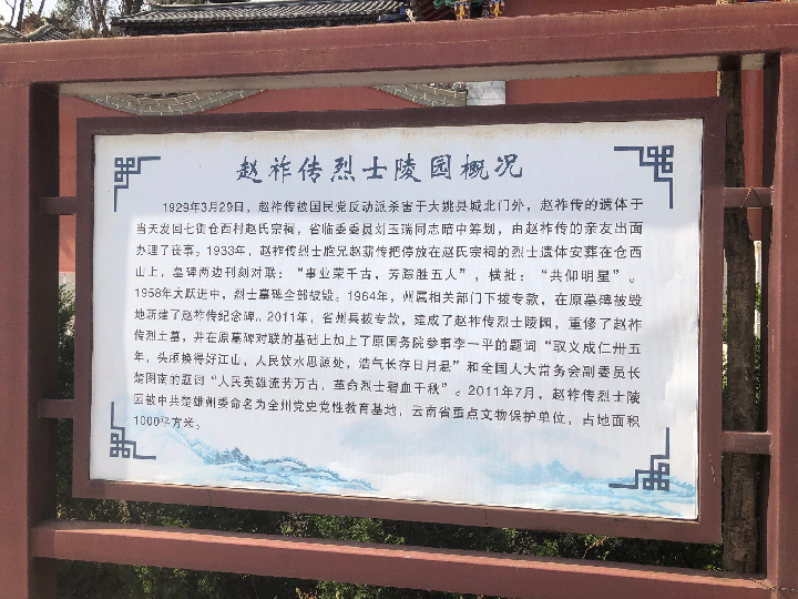 赵祚传烈士是云南早期党组织工作的开创者之一,对云南早期农民运动作出了重要贡献。他生于1903年,牺牲于1929年,年仅26岁。赵祚传从小聪明好学,少年时代忧国忧民,青年时代立志报效国家和人民。1925年秋考入上海大学,1926年秋加入中国共产党,1927年春受中共中央和广东区委派,回云南工作,1928年4月,中共云南省特别委员会书记。为支持革命,他曾三次变卖家产,1927年“四一二”反革命政变后三次被捕入狱,在狱中他将生死置之度外,和敌人进行了坚贞不屈的斗争。