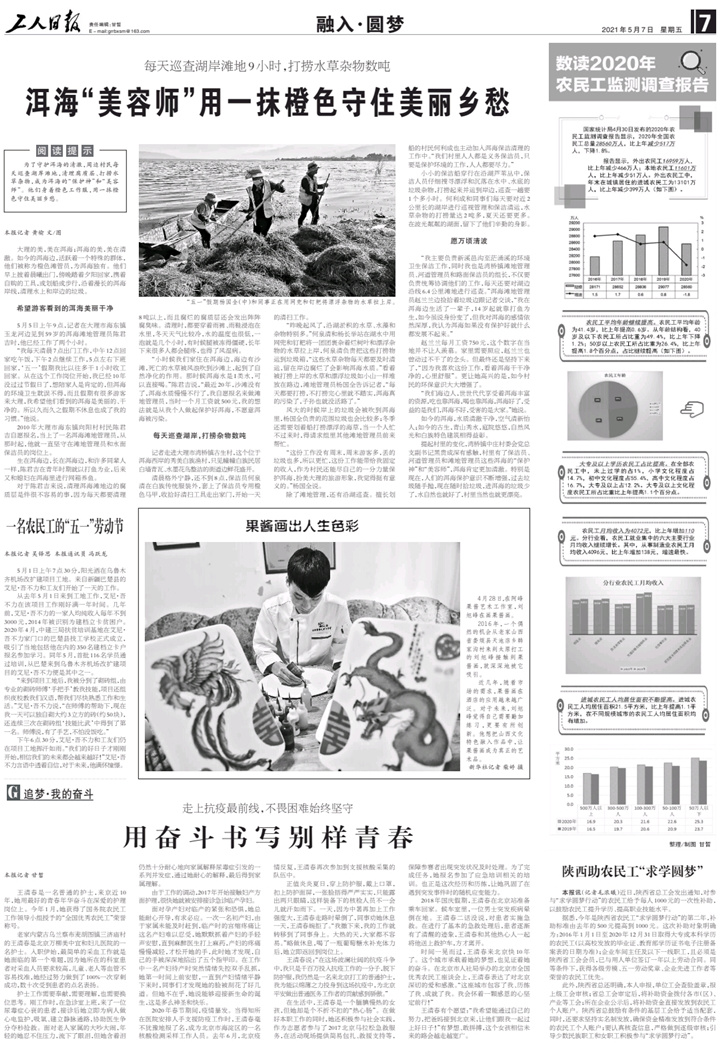 《工人日报》(2021年05月07日 07版) 每天巡查湖岸滩地 9小时,打捞水草杂物数吨 洱海“美容师”用一抹橙色守住美丽乡愁 本报记者 黄榆 文/图