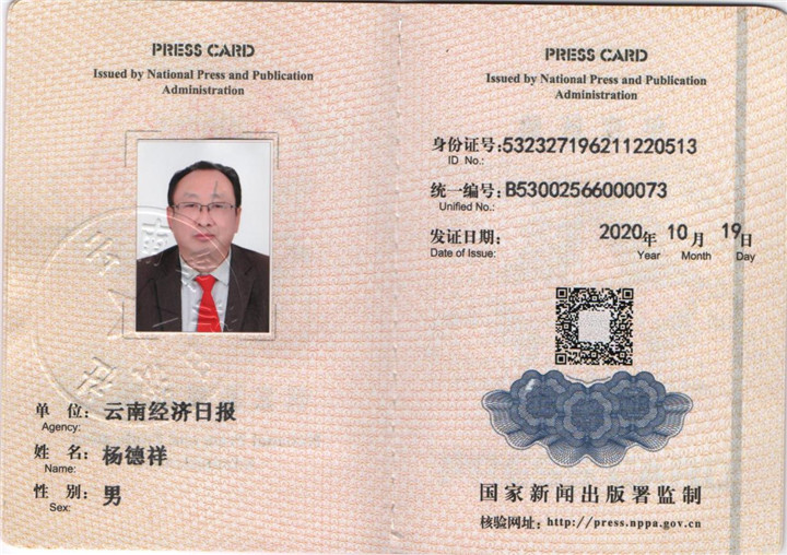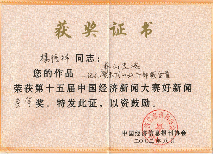 杨德祥记者证 根深叶茂 新闻战线显身手 由于我吃苦耐劳,勤奋学习,工作出色,多次荣获《云南经济日报》优秀通讯员一等奖,1996年初云南经济日报社总编杨新民等领导亲自深入山区永仁县考察我,1996年4月1日借调到云南经济日报楚雄记者站工作,1996年9月把我正式办理了调动手续调到云南经济日报社驻楚雄州记者站工作,任专职记者、常务副站长。到云南经济日报社驻楚雄州记者站后,我的工作担子更重、更繁忙了,报社要求我每月采写稿件5至7件,我月月都超额完成任务。 云南经济日报社2000年10月聘任我担任《云南经济日报·楚雄经济》特刊主编;2001年12月,我获得了中共中央党校函授学院经济管理专业本科毕业证;2008年1月获得了由中国商业联合会颁发的《注册高级商务策划师》资格证书;2009年2月获得了美国西南国际大学MBA工商管理硕士研究生毕业证书和学位证书;2009年1月9日我主编的《云南经济日报·楚雄经济》专刊被云南经济日报社评为2008年度优秀专刊及先进工作者;2009年9月8日云南经济日报社颁发给楚雄记者站,为在“7·09”姚安6.0级地震中反应迅速、行动及时、不怕苦和累,在采访报道过程中取得了优异成绩,为报社争得了荣誉。