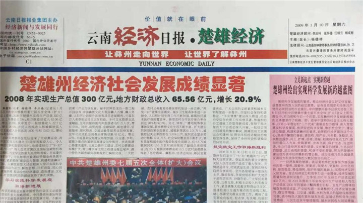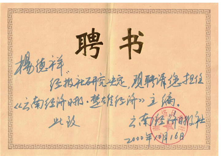 杨德祥主编聘书 为了进一步加大楚雄彝族自治州的对外宣传力度,在报社编委、楚雄州委、州政府的关心支持下,我在全省各地州记者站中率先于1997年8月21日,在《云南经济日报》上开辟了《楚雄版》,在“告读者”中明确提出:《楚雄版》是为进一步宣传楚雄,提高楚雄州知名度,促进彝州经济腾飞而创办的,也是报社面向基层,增强可读性的一项措施。它坚持党的“一个中心,两个基本点”的基本路线,“让彝州走向世界,让世界了解彝州,为彝州物质文明和精神文明建设服务”。原楚雄彝族自治州州委书记吴朝顺,为《楚雄版》题词:“办好云南经济日报楚雄版,促进彝州经济建设”。原楚雄州人民政府州长罗正富为《楚雄版》题词:“办好云南经济日报楚雄版,让彝州走向世界,让世界了解彝州”。在云南经济日报社和楚雄州委、州人民政府、州人大、州政协的关心支持下,经有关新闻出版部门批准,2000年10月20日我又创办试刊了对开《云南经济日报·楚雄经济》(是《云南经济日报》的5、6、7、8版),应报社领导厚爱被聘请担任主编,试刊得到楚雄州各级领导的极大重视和支持,收到积极效果,使《云南经济日报·楚雄经济》于2001年1月3日正式创刊,2002年10月1日,我又把《云南经济日报·楚雄经济》改革为彩色对开大报,深受群众的欢迎、鼓励和好评。根据2013年3月6日攀枝花党政代表团到楚雄,与楚雄州党政代表团交流,双方共同达成,规划共绘、通道共建、建设无障碍旅游区,共同建设友好城市,加强合作协作,都提出希望有宣传交流平台的共同愿望。2013年3月底,我在原《云南经济日报·楚雄经济》基础上开辟了《云南经济日报·川滇经济》园地,旨在“打造川滇交流平台,促进川滇经济发展,让川滇走向世界,让世界走进川滇”。更好地把攀枝花市和楚雄州两个川滇交接黄金线上的城市紧密相连接,达到双方进一步加强了解,相互学习,互联互通,共同建设无障碍旅游区和友好城市,共同提高发展的目的。自《云南经济日报·川滇经济》园地开办以来,得到中共攀枝花市委宣传部和中共楚雄州委宣传部的高度重视和关心支持,中共楚雄州委外宣办、楚雄州人民政府新闻办,中共攀枝花市委外宣办、攀枝花市人民政府新闻办分别发出红头文件作为本刊的指导单位,双方宣传部并于2016年6月10日在攀枝花市召开《云南经济日报·川滇经济》宣传交流座谈会,2016年初我开通了《云南经济日报·川滇经济》公众号,2019年11月8日记者节开通了《云南经济新闻网.楚雄频道(川滇频道)》,为楚雄州和攀枝花市对外宣传作出了积极的努力。