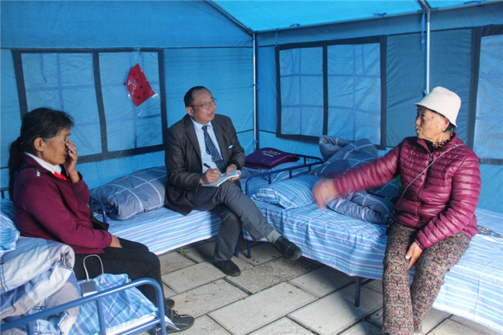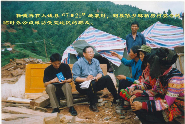 杨德祥(左2)在大姚县“7·21”地震时,到昙华乡麻秸房村委会的临时办公点与大红山村民采访座谈