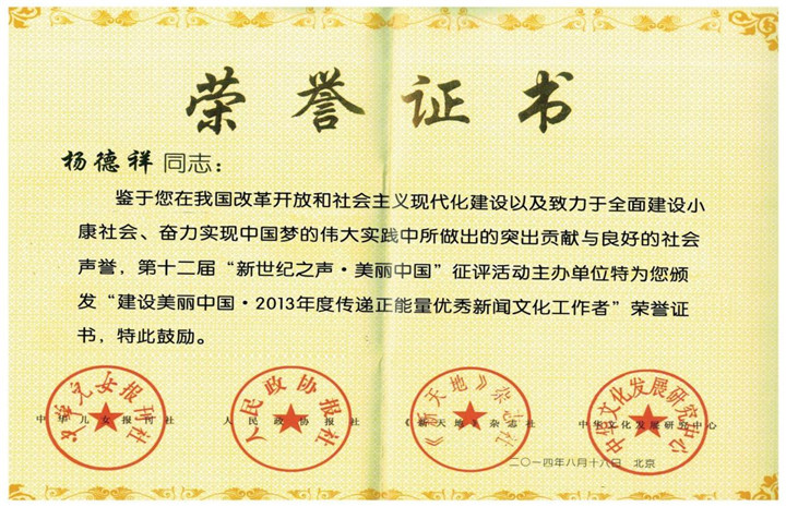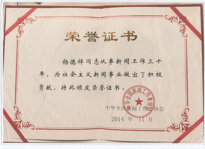 杨德祥荣誉证书 当别人问我多年来采写新闻报道的经验和体会是什么时,我说:经验没有什么,还需要正好学习,平时主要是多看报纸、多听广播、多看新闻,腿勤多跑,眼观六路,不耻下问,耳听八方,勤于思考,多写多发快写快发,热爱是最好的老师! 为了热爱的新闻事业,我活得很累,很辛苦,很紧张,由于长时间写稿、编稿、审稿和看报刊,我戴上了五百度的近视眼镜,甚至眼睛做了白内障手术,但我决不后悔,因为我深深爱上了新闻工作这一高尚而神圣的事业,再苦再累我也心甘情愿,心里也是甜蜜蜜的,我乐意这样苦一辈子,愿把终生献给党的新闻事业,哪怕是还有一口气,我都要为党和人民鼓与呼! “热爱是最好的老师”、“世上无难事,只要肯登攀”这是真理!前人有总结,今人有体会! |