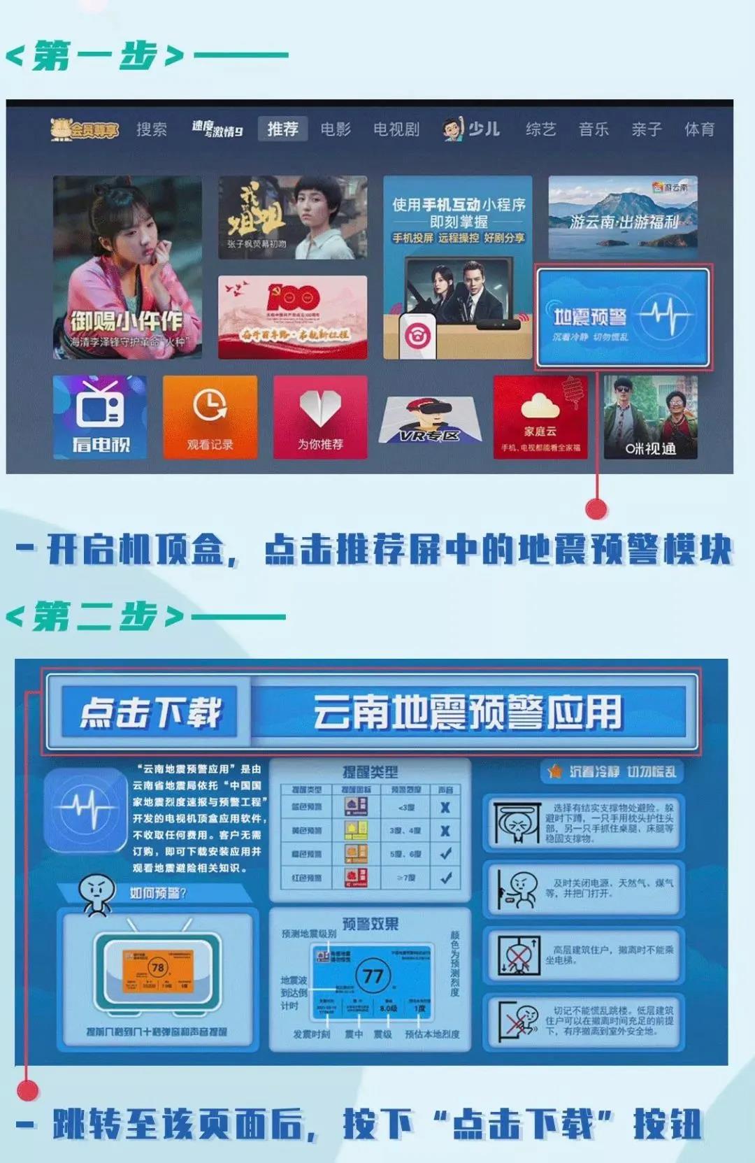 根据《云南省地震预警管理规定》,地震预警信息由省地震工作主管部门通过地震预警系统向社会统一发布,其他任何单位和个人不得擅自向社会发布地震预警信息,不得编造、传播虚假地震预警信息。陈静建议,除了收看电视地震预警信息外,广大市民应主要关注官方发布的地震预警信息,比如关注“中国地震台网”“地震公众服务”等官方微信公众号和@云南省地震局、@昆明防震等官方微博。 收到地震预警信息切勿慌乱 网上一直流传一句“小震不用跑,大震跑不了”,那有了地震预警应该如何正确看待呢? 昆明市防震减灾局局长靳树才提醒,收到地震预警信息后,一般会有几秒到几十秒的避险逃生时间,首先要保持冷静不慌乱,然后快速判断自己所处的位置和实际环境,如果预警时间足够我们撤离,应该快速撤离到远离建筑物的空旷地带;如预警时间不够,应就近避险,然后迅速撤离。 地震预警安装指南 日前,云南省地震局发布了云南“地震预警安装指南”。“云南地震预警”是由云南省地震局联合云南电信、云南移动发布的地震预警官方应用,用户可根据自己所处的实际环境,选择快速避震措施,减少人员伤亡。 自昆明在中国电信、中国移动宽带网络电视(盒子上)应用上开通了地震预警功能后,只要家里安装了机顶盒,在网络电视首页就可以下载安装应用(并观看地震避险相关知识),安装成功后该应用将自动运行。 |