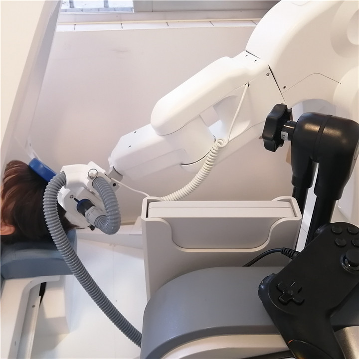 楚雄州第二人民医院于2014年开始开展经颅磁刺激,治疗精神科各类疾病,特别是在一些难治性抑郁症、焦虑、睡眠障碍、强迫症的治疗上取得了显著的成效。为了能够更好的服务于患者及取得更好的治疗效果,楚雄州第二人民医院康复科于2021年7月12日新增了一台“阿米磁刺激机器人”。阿米磁刺激机器人首次将人脸识别技术用于TMS定位;可以快速实现首次精准定位、精准重复定位、智能跟随定位。通过空间定位算法将刺激靶点映射到头模对应位置,并将空间位置实时输入到阿米磁刺激机器人系统,经系统控制线圈拍到达治疗靶点,以此保证患者的经颅磁刺激治疗的靶点精准,避免了TMS治疗过程中由于手工定位不准确、定位后患者的移动导致定位后的重复刺激不准确、后期的重复刺激不准确等影响疗效的风险。 |