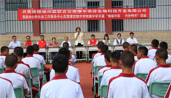 新时代民族网讯(摩尔农庄 云南经济日报记者杨德祥)为加强对未成年人的关心关爱,9月20日上午,共青团楚雄州委联合云南摩尔农庄生物科技开发有限公司、楚雄州第二人民医院,楚雄市心悦社会工作服务中心赴楚雄实验中学附属中学开展“情暖中秋 共赴明天”系列关怀慰问活动,为44名学生捐助价值7000余元的书籍、月饼和核桃乳。