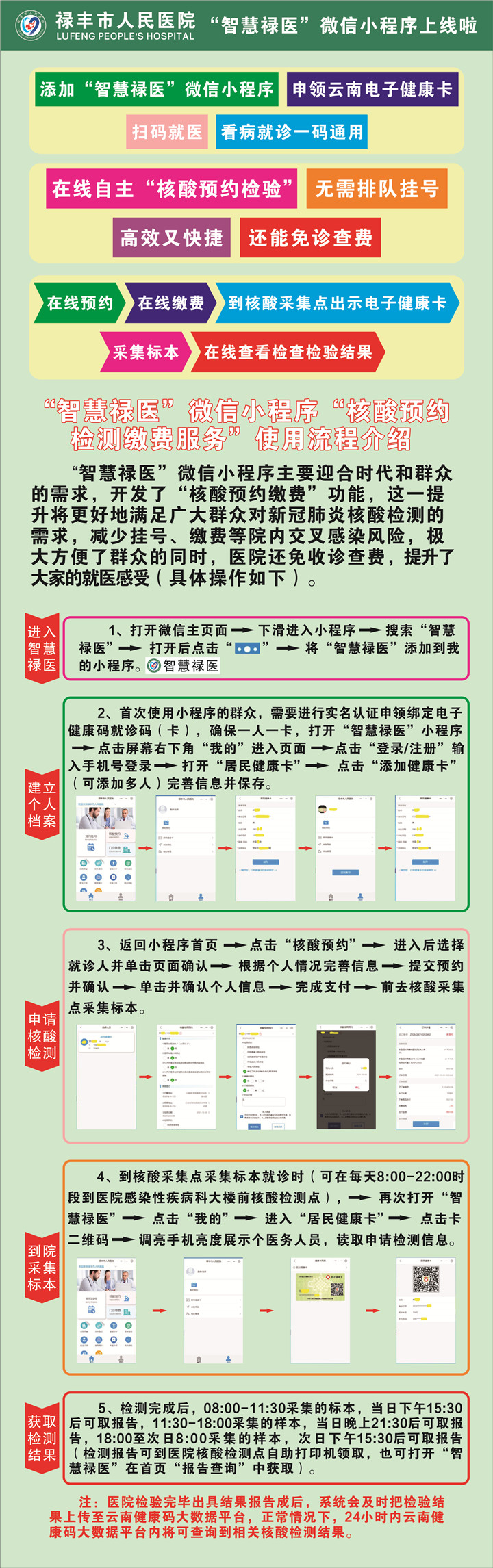 | 发展信息医疗 深化便民服务——禄丰市人民医院“智慧禄医”微信小程序正式开通核酸检测预约缴费服务 | |