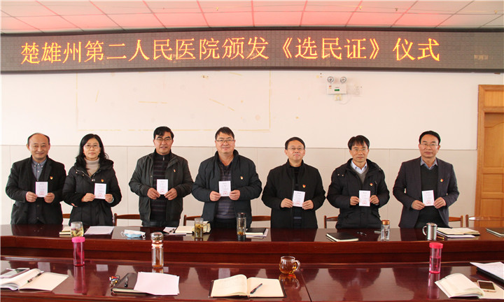 并在楚雄州第二人民医院行政楼六楼会议室举行颁发《选民证》仪式。党总支书记、院长代必洪要求楚雄州第二人民医院全体选民要积极参加投票选举,充分行使自身民主权利,投好庄严神圣的一票。