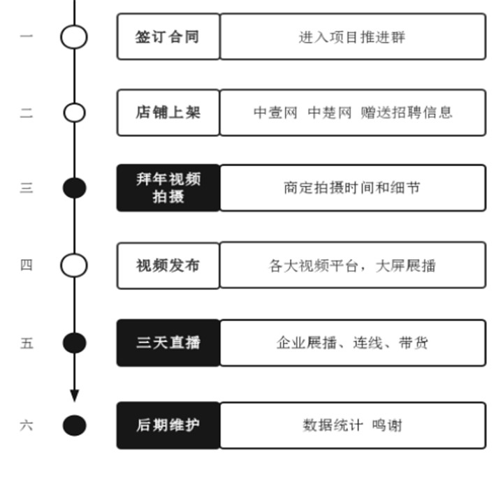 注: ①所有信息都将会在项目推进群内发布,并能在群里找到相关工作人员; ②上架店铺以及商品链接,为了直播间能够搭建商品购买渠道; ③拜年视频在确定拍摄时间后即可安排工作人员拍摄,拍摄完成后两天内交片; ④视频发布在交片后一天内发布; ⑤直播有红包雨,有奖问答,抽奖,网红互动等内容,直播可永久回放; ⑥视频鸣谢以及后期衔接活动预告。