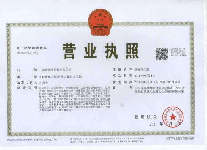 注: ①所有信息都将会在项目推进群内发布,并能在群里找到相关工作人员; ②上架店铺以及商品链接,为了直播间能够搭建商品购买渠道; ③拜年视频在确定拍摄时间后即可安排工作人员拍摄,拍摄完成后两天内交片; ④视频发布在交片后一天内发布; ⑤直播有红包雨,有奖问答,抽奖,网红互动等内容,直播可永久回放; ⑥视频鸣谢以及后期衔接活动预告。 四、保障措施 中国.楚雄.首届拜年节 执行书 中国.楚雄.首届拜年节,由____________局、_________协会、云南经济日报、楚雄州电视台指导,云南滇影文化传媒有限公司、楚雄新理三国影视传媒有限公司、云南艺讯传媒有限公司共同策划并执行以下活动: 二、活动主题:《中国.楚雄.首届拜年节》 三、活动理念:年终防疫战-百企大拜年.线上大联欢 四、活动场地:30000+人气的网络直播间 五、活动时间:2021年12月30日-2022年1月27日 六、活动流程:1月25、26、27日19:00-22:00专属直播间直播 七、活动内容:以《中国.楚雄.首届拜年节 特此证明 活动指导单位: 策划与执行公司: 云南壹站通传媒有限公司 相关资质证书: