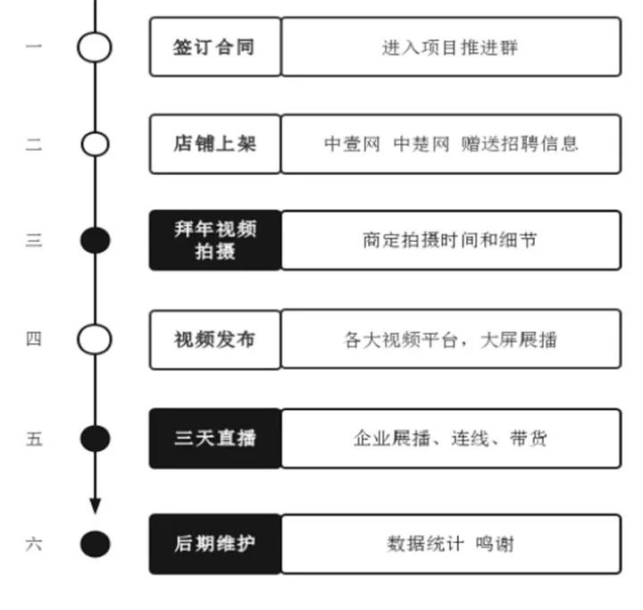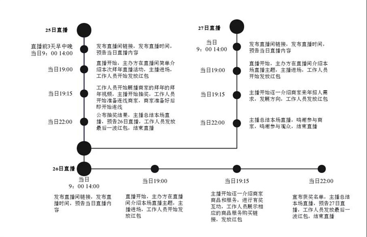 尊敬的?先生/女士 云南滇影文化传媒有限公司联合楚雄新三国影视传媒有限公司、云南艺讯传播有限公司,云南日报楚雄经营部共同主办的“百企大拜年 线上的大联欢”为主题的 首届拜年节已蓄势待发。为了更全面地彰显我州本土企业参与社会公益活动的社会职能,进一步扩大企业的影响力和企业的社会形象。 现就活动向您做如下陈述,希望有你们的参与更精彩! 跨度时间:2021年12月30日——2022年1月27日截至 活动时间:2022年1月25日(全天) 2022年1月26日(全天) 2022年1月27日(全天) 一、 社会效益:通过线上直播普及疫情防护小常识,为全州人民打造一个安全和谐的社会环境贡献绵薄之力,通过线上拜年和互动,将拜年祝福带进千家万户,为传递彝州过年文化做出奉献; 经济效益:借助直播带货,为企业排忧解难,降低了宣传成本;借助线上游戏互动,为参与者提供展示机会,提升了活动的参与度; 媒体效益:采用最前沿的网络直播技术,推动了我们彝州融媒体事业的发展。 二、活动描述 活动主题:百企大拜年 线上大联欢 活动对象:口碑、人气、实力规模排名前100名的本土型公司 爱心捐助、扶贫贡献的个体/企业 全州范围内的中小学、幼儿园。 活动形式:网络直播 活动场所:30000+人气的直播间 活动时间:2022年1月25、26、27日 活动流程: