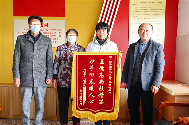 “是董医生救了我,我们全家都很感激她,所以,我们今天无论如何都要将这面锦旗送给你,表示我们的感谢。”吴奶奶一直握着董主任的手,眼里满是泪花。 “奶奶,我是医生,这是我们应该做的,您的健康是我们最大的幸福。”分别之际,董主任叮嘱老人要按时吃药,保持愉悦的心情。