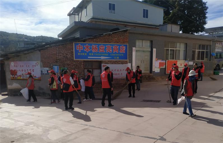 志愿者们身穿红马甲,手持扫把、锄头,为社区环境卫生干净整洁贡献力量。