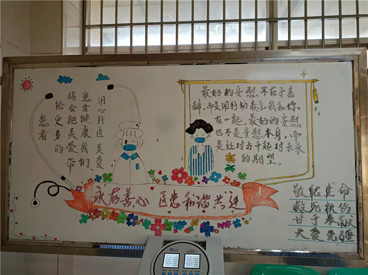 即使相隔千山万水,我也可以见到你 为了改善以往单调的病房环境,让患者增添温馨感,科室职工集思广益,在科室主任护士长的号召下对病房进行了“改造”。我们画一幅画点缀着病人物品保管室,病房走廊我们粘贴一抹绿色,给病房一片勃勃生机。许多病人说:太漂亮了,多贴几幅在墙上。就连平日里孤僻懒散的病人也会站在画前流连忘返、面带微笑。