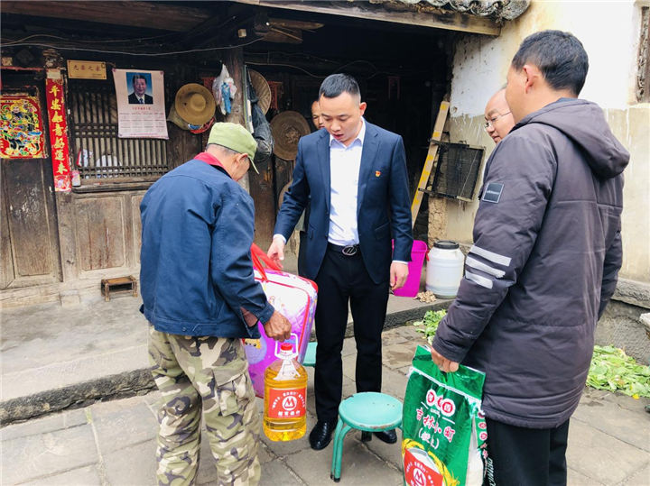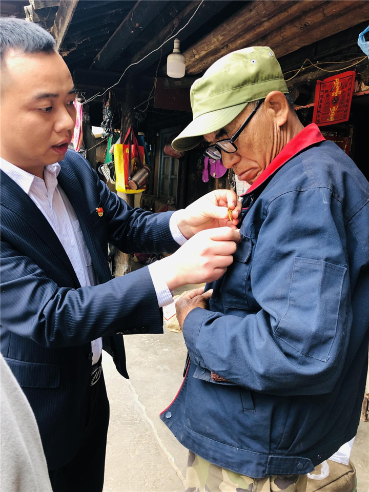 谢志祥为普永贵整理衣服,佩戴党徽和参战老兵徽章 招商银行昆明分行驻村“第一书记”谢志祥,出生:1988年9月,四川省内江市资中县人,2007年12月于内江市资中县人武部应征入伍,2012年5月入党,参加过2008年5月12日汶川抗震救灾任务,2019年12月退出现役。2021年5月由政府安置到招商银行股份有限公司昆明分行工作,2021年5月17日安排到楚雄州永仁县维的乡维的村任驻村第一书记。退役后的谢志祥对老革命老军人一直都怀有一种特殊的感情,时刻牢记没有先辈们的浴血奋战、保家卫国,就没有我们今天的幸福生活,常怀对老革命的感恩之情,从未忘记自己曾经是一名军人,是一名退伍不褪色的转业老兵。春节前夕当谢志祥听到所驻村有一名两次参战老兵后,心里第一想到老班长老领导的生活问题,因为部队传统就是早一天当兵那都是自己的老班长、老领导。所以谢志祥第一时间想到的是从自己工资里拿出一部分钱,购买了大米,食用油,羽绒被,来到参战老兵普永贵家中看望慰问,详细询问了参战老兵的身体状况、家庭情况、经济来源和生活近况。在慰问期间,谢志祥还再三叮嘱如果生活中遇到有任何困难,可以随时到村委会找他,将尽最大努力去解决和帮助老人。