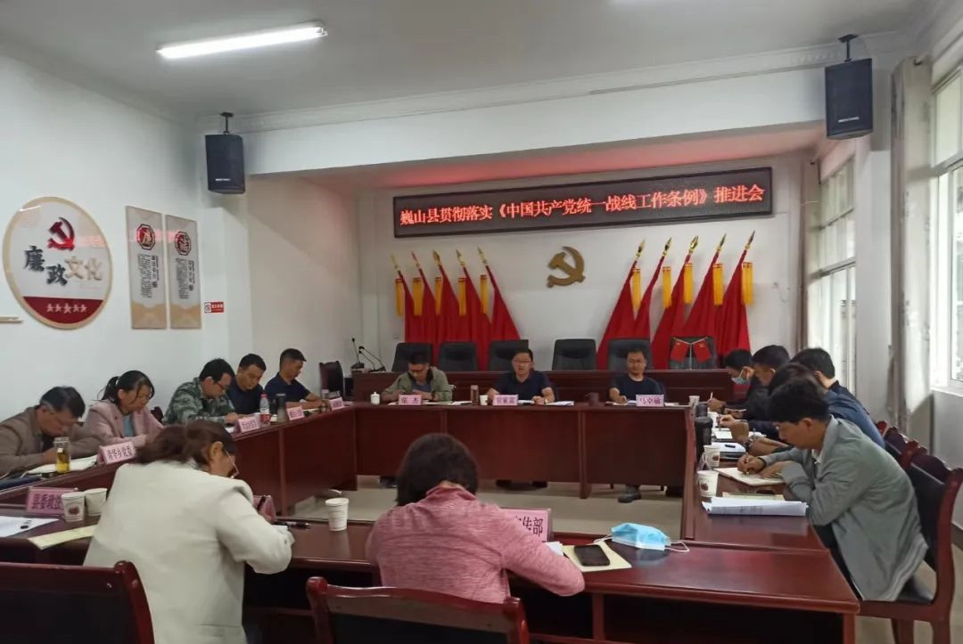 新时代民族网讯(民族时报记者陈明海)为进一步深入学习贯彻习近平总书记关于加强和改进统一战线工作的重要思想和《中国共产党统一战线工作条例》,6月16日,巍山县委统战部(县民族宗教事务局)召开贯彻落实《中国共产党统一战线工作条例》推进会。县委常委、县委统战部部长官家富出席会议并讲话。  会议传达学习了州委对台工作会议精神和州委杨国宗书记对全州对台工作的重要批示,领学了《中国共产党统一战线工作条例》(以下简称《条例》),并就贯彻落实《条例》工作进行了再安排再部署。会议指出,《条例》是统一战线领域的基础主干党内法规,是新时代统一战线工作的基本遵循,是开展统一战线工作的重要法宝。贯彻落实《条例》,对提高统战工作科学化、规范化、制度化水平具有重要而深远的意义。会议强调,要提高站位,全面加强党对统一战线工作的集中统一领导;要以实施“云岭同心”工程为支撑,全面推动统一战线工作提质增效;要提高思想自觉,推动统战工作守正创新;要加强行动自觉,用《条例》规范和指导工作。会议要求,要以贯彻落实《条例》为契机,全面加快民族团结进步标杆建设,坚持以“有一个完整的工作方案、有一套有力的推进机制,有一个突出的工作亮点,有一份精炼的总结材料、有一个浓厚的宣传氛围、有一套完善的档案资料、有一套顺畅的观摩流程、有一个优秀的讲解员”的要求,全面做好新时期统战工作,确保各项工作提质增效。县委政法委、县委组织部、县委宣传部及各乡镇党委副书记参加会议。(巍山县委统战部供稿)