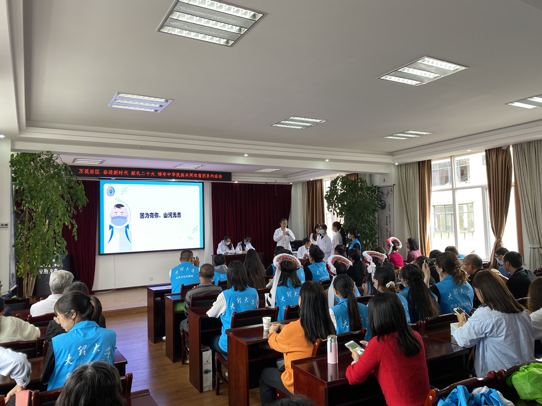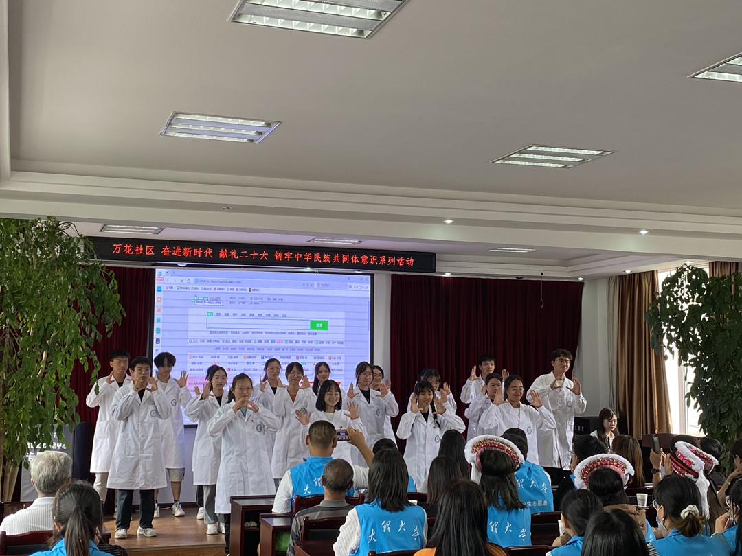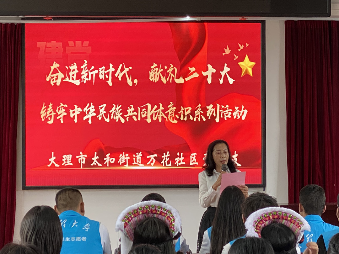 新时代民族网讯(韩溶 民族时报记者陈明海)2022年7月1日下午,万花社区党总支组织11家“同心圆”党建联盟单位、大理大学公共卫生学院、辖区党员开展“奋进新时代 献礼二十大 铸牢中华民族共同体意识”主题活动。 喜迎二十大 青年心向党 大理大学公共卫生学院以疫情防控为主题表演的情景剧“携手奋进,疫不容辞”,表现了在新型冠状病毒感染的肺炎疫情肆虐全国时,基层的一群人,以自己平凡的坚守,让一场没有硝烟的战争在神州大地处处打响。精彩的演绎深深打动着、感染着大家,不时赢得阵阵掌声。社区党总支鼓励青年们要踏着先辈的足迹,勤奋学习,刻苦钻研,顽强拼搏,为国家富强、民族复兴、人民幸福贡献自己的力量。