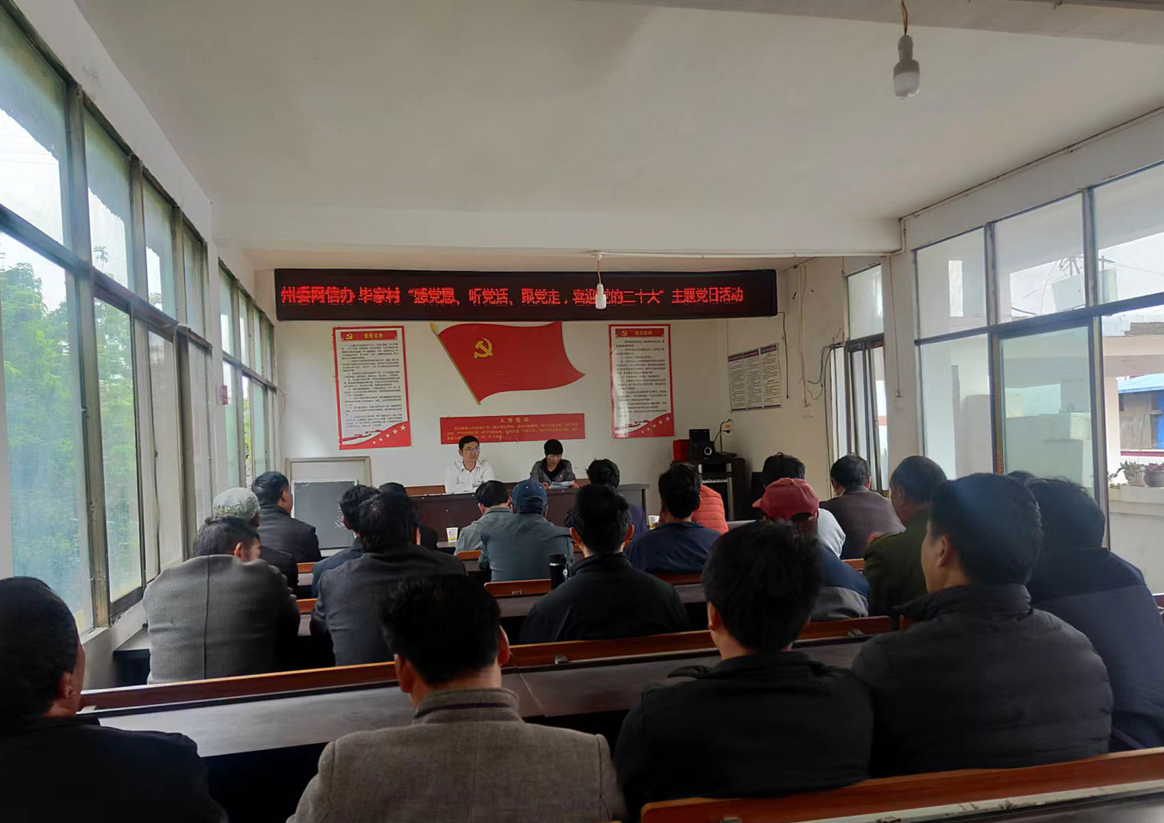 开展一次座谈会。挂包单位楚雄州委网信办机关党支部朱成玉主任一行和毕家村党总支全体党员,面对着鲜红的旗帜,重温入党誓词。宣誓仪式后,由州委网信办主任朱成玉以“感党恩,听党话,跟党走,喜迎党的二十大”为主题的主题党课。
