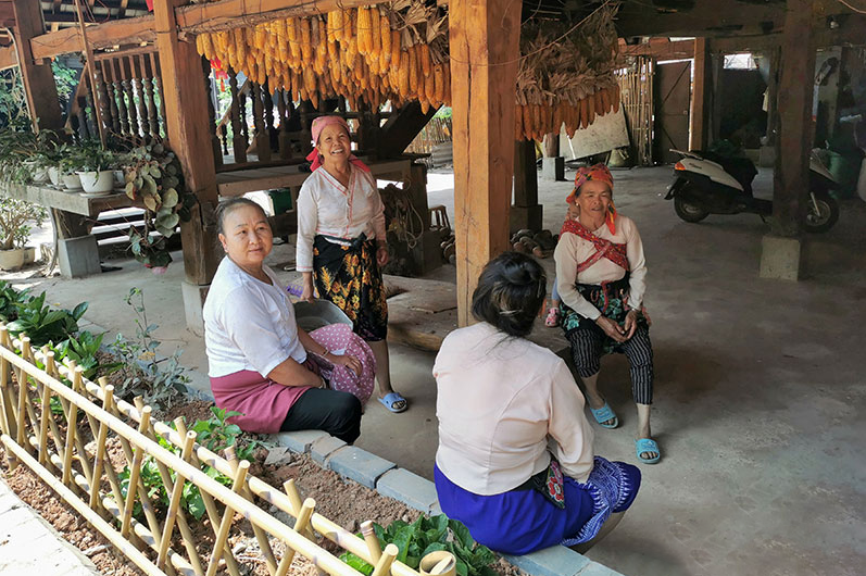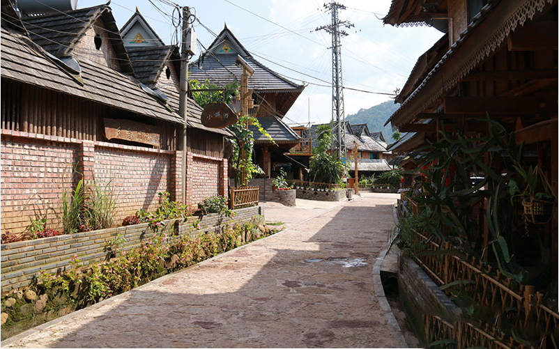 (在一楼休憩攀谈的当地村民) 通过赵珍的示范带头,不少人也纷纷跟了上来,甚至相互之间形成了“攀比”:比一比谁的家里收拾得更干净,谁家的庭院更漂亮。家家户户在门口种满了花草,屋檐上挂上了盆栽,让整个寨子充满着田园与民族气息。城子三寨的傣族传统民居建筑群还被列为了云南省第七批省级文物保护单位。 环境好了,游客也多了起来。有一技之长的村民,还把一楼开发成了店面,售卖一些手工艺品、民族服装、供应傣族美食等。生意最好时,日均收入超过5800元。