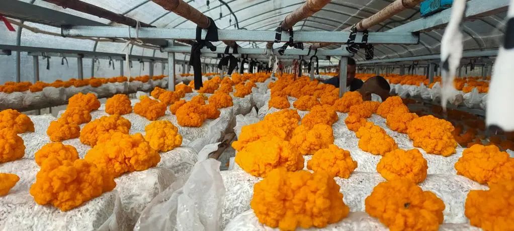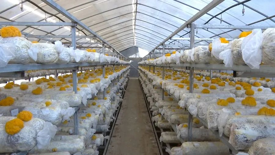 大棚中长势喜人的金耳 其中,食用菌种植的部分由牟定明恒农业开发有限公司负责。据介绍,在成片的光伏板下,共建有122个标准食用菌大棚。每年10月份至次年7月份,园区将根据市场需求,种植金耳、羊肚菌、香菇、白参、平菇等食用菌品种,年产值可达1000万元。 “光伏+食用菌”模式的成功,不仅为牟定当地带来稳定的税收,更为当地乡村振兴提供源源不断的动力。