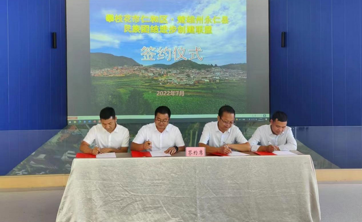 新时代民族网讯(民族时报记者 陈明海)近日,为跨区域协同推进民族团结进步创建工作,促进全社会铸牢中华民族共同体意识,云南省楚雄州永仁县与四川省攀枝花市仁和区共创跨县区民族团结进步创建联盟签约仪式在仁和区举行。中共永仁县委常委、统战部部长罗德宝、县民族宗教局局长杨德新,中共仁和区委常委、统战部部长冯仁军、区民族宗教局局长王春云共同签署 了《楚雄州永仁县与攀枝花市仁和区民族团结进步创建联盟公约》。