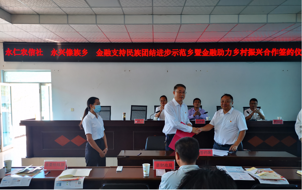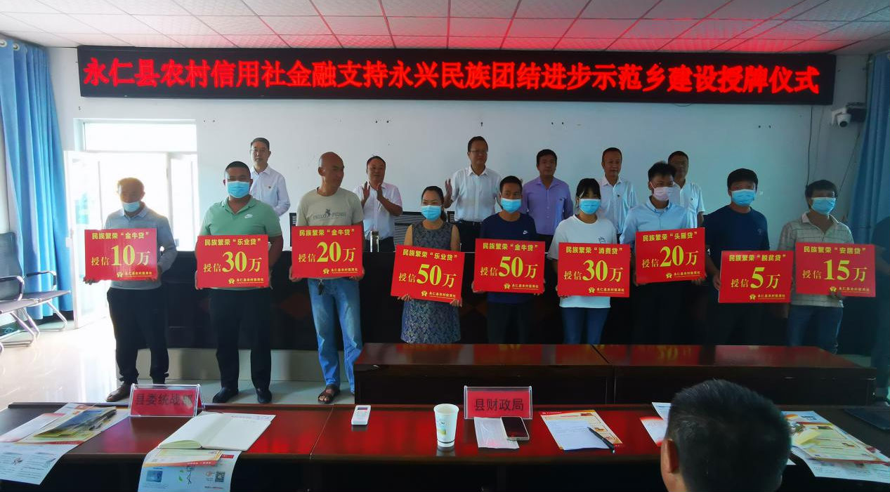 中共永仁县委常委、统战部长罗德宝同志出席启动仪式并讲话。县农信社与永兴乡人民政府签订了金融支持民族团结进步示范乡建设合作协议。参会领导为永兴乡首批获得金融支持的市场主体代表授牌。按照《楚雄州金融支持民族乡建设工作方案》,永仁县金融部门推出了民族繁荣头雁贷、民族繁荣安居贷、民族繁荣乐业贷、民族繁荣脱贫贷、民族繁荣兴农贷、民族繁荣云牧贷和民族繁荣宜薪贷7种民族团结进步示范区建设特色贷款。贷款降低了获贷门槛、给予利率优惠、减轻融资负担,着力从政策保障、重点领域、涉农服务、普惠金融四个方面推动金融支持永兴乡民族团结进步示范乡建设向纵深发展。