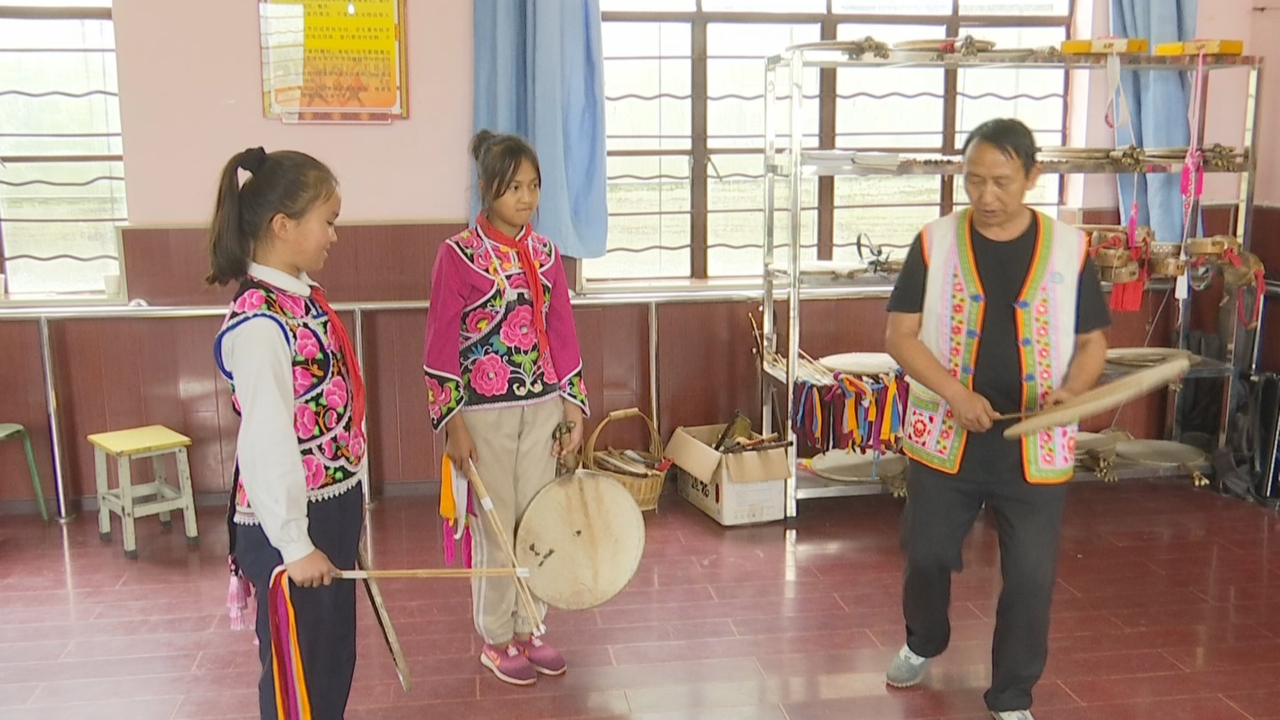 在州立楚雄市民族小学民族舞教室,省级非遗传承人何应贵正在教授学生们跳羊皮鼓舞,通过非遗进校活动不仅丰富校园生活,也让非遗项目的传承从娃娃抓起。